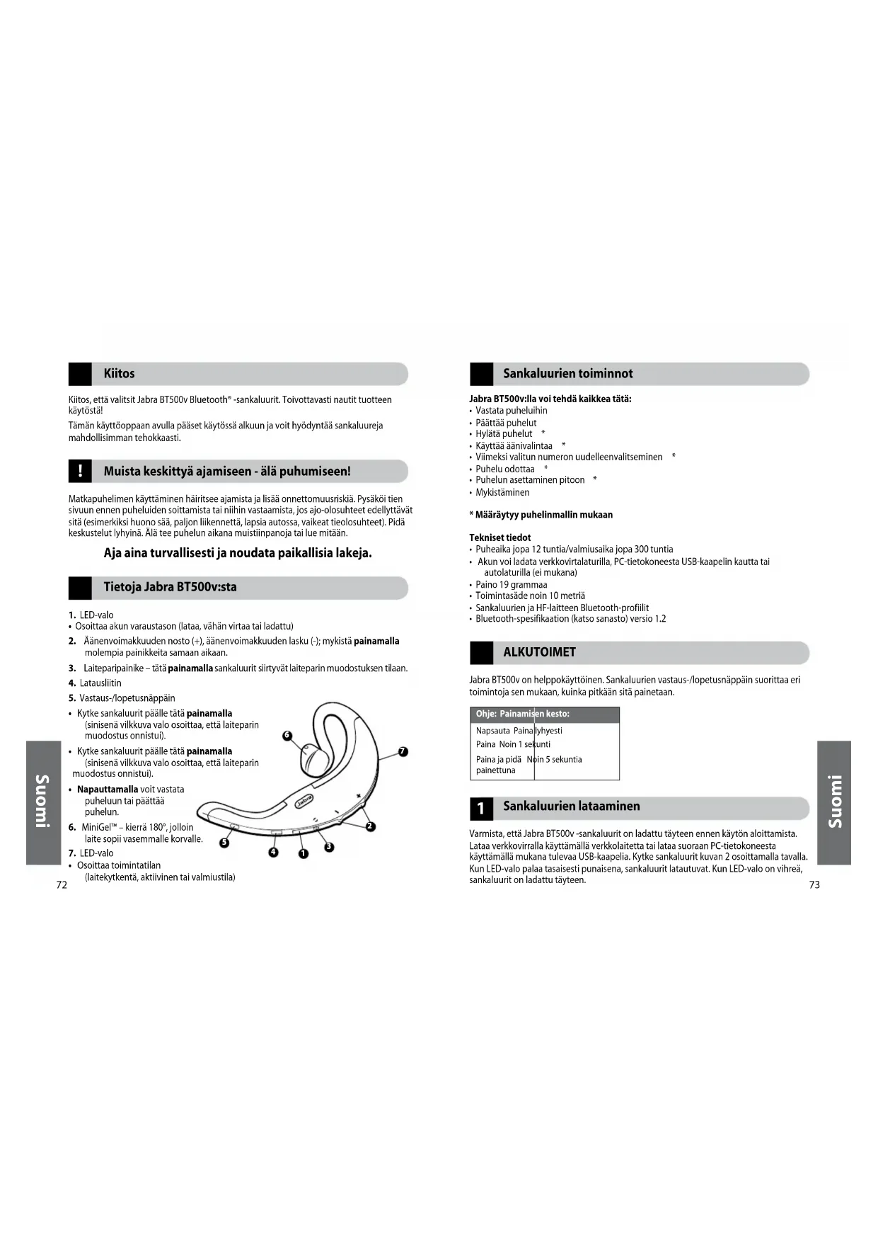 Kiitos, että valitsit Jabra BT500v Bluetooth® -sankaluurit. Toivottavasti nautit tuotteen