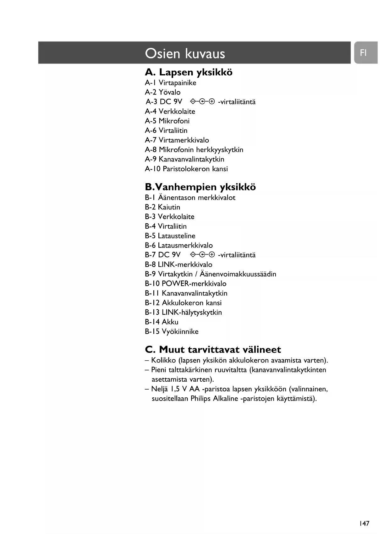– Neljä 1,5 V AA -paristoa lapsen yksikköön (valinnainen,