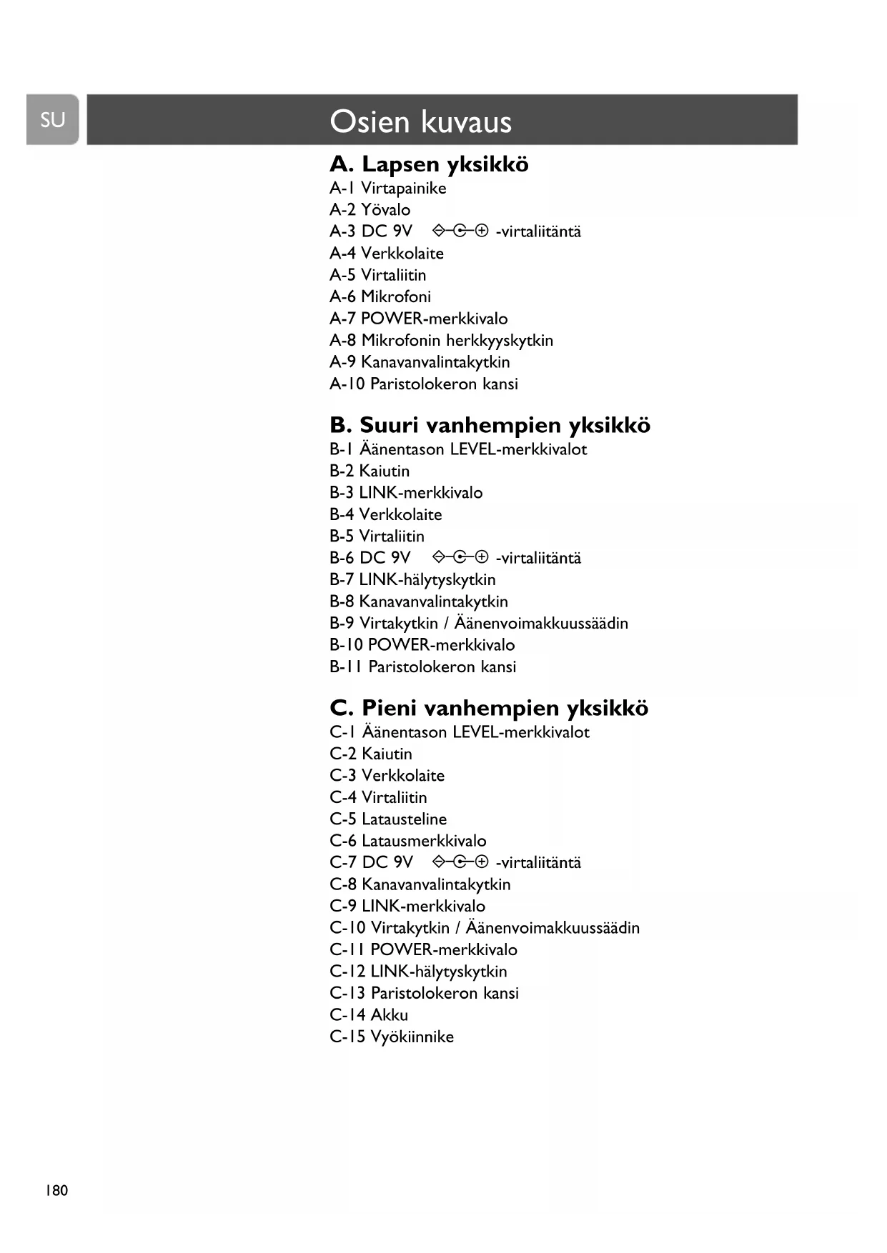 – Neljä 1,5 V AA -paristoa lapsen yksikköön (valinnainen,