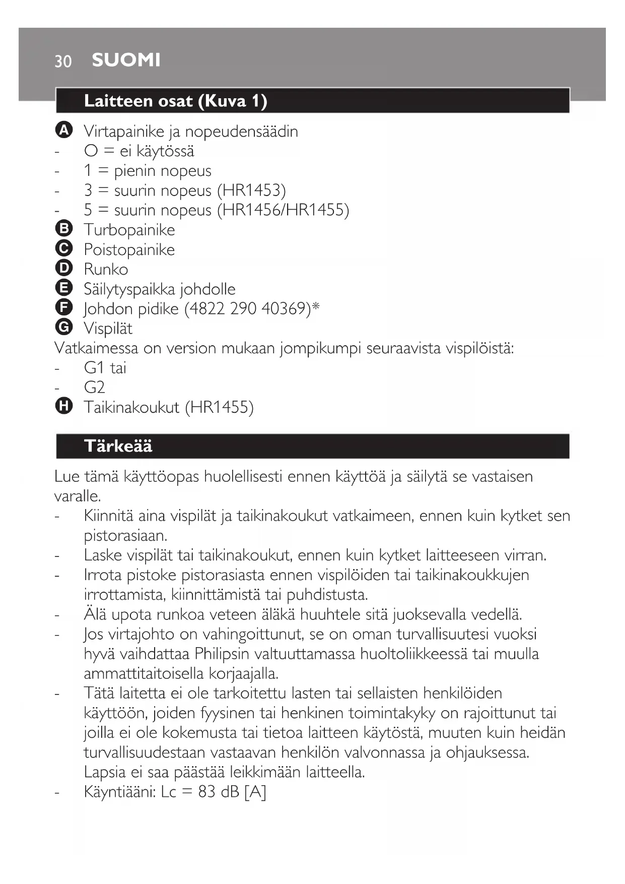 H Taikinakoukut (HR1455) Tärkeää Lue tämä käyttöopas huolellisesti ennen käyttöä ja säilytä se vastaisen varalle. Kiinnitä aina vispilät ja taikinakoukut vatkaimeen, ennen kuin kytket sen pistorasiaan. Laske vispilät tai taikinakoukut, ennen kuin kytket laitteeseen virran. Irrota pistoke pistorasiasta ennen vispilöiden tai taikinakoukkujen irrottamista, kiinnittämistä tai puhdistusta. Älä upota runkoa veteen äläkä huuhtele sitä juoksevalla vedellä. Jos virtajohto on vahingoittunut, se on oman turvallisuutesi vuoksi hyvä vaihdattaa Philipsin valtuuttamassa huoltoliikkeessä tai muulla ammattitaitoisella korjaajalla. Tätä laitetta ei ole tarkoitettu lasten tai sellaisten henkilöiden käyttöön, joiden fyysinen tai henkinen toimintakyky on rajoittunut tai joilla ei ole kokemusta tai tietoa laitteen käytöstä, muuten kuin heidän turvallisuudestaan vastaavan henkilön valvonnassa ja ohjauksessa. Lapsia ei saa päästää leikkimään laitteella. Käyntiääni: Lc = 83 dB [A]