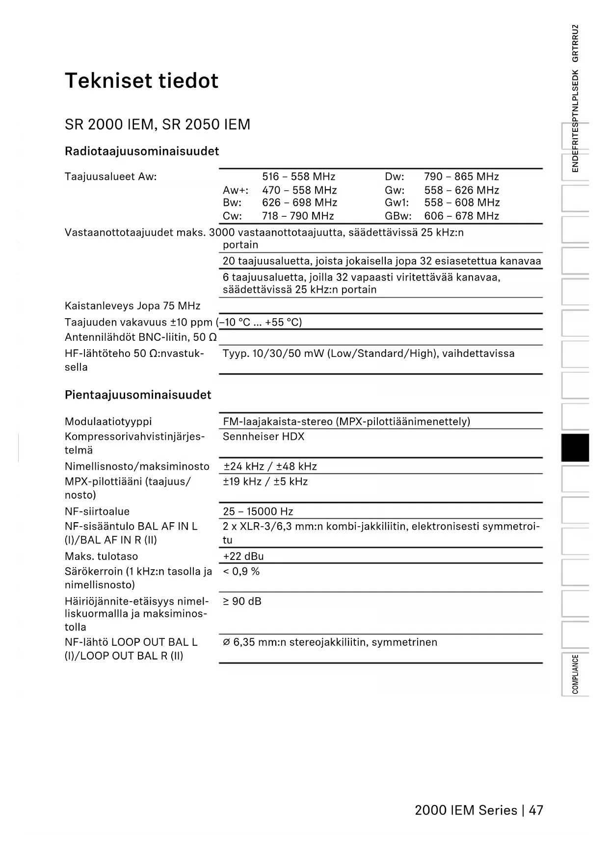 Radiotaajuusominaisuudet Taajuusalueet Aw: Aw+: Bw: Cw: 516 – 558 MHz 470 – 558 MHz 626 – 698 MHz 718 – 790 MHz Dw: Gw: Gw1: GBw: 790 – 865 MHz 558 – 626 MHz 558 – 608 MHz 606 – 678 MHz Vastaanottotaajuudet maks. 3000 vastaanottotaajuutta, säädettävissä 25 kHz:n portain 20 taajuusaluetta, joista jokaisella jopa 32 esiasetettua kanavaa 6 taajuusaluetta, joilla 32 vapaasti viritettävää kanavaa, säädettävissä 25 kHz:n portain Kaistanleveys Jopa 75 MHz Taajuuden vakavuus ±10 ppm (–10 °C ... +55 °C) Antennilähdöt BNC-liitin, 50 Ω HF-lähtöteho 50 Ω:nvastuk- sella Tyyp. 10/30/50 mW (Low/Standard/High), vaihdettavissa Pientaajuusominaisuudet Modulaatiotyyppi FM-laajakaista-stereo (MPX-pilottiäänimenettely) Kompressorivahvistinjärjes- telmä Sennheiser HDX Nimellisnosto/maksiminosto ±24 kHz / ±48 kHz MPX-pilottiääni (taajuus/ nosto) ±19 kHz / ±5 kHz NF-siirtoalue 25 – 15000 Hz NF-sisääntulo BAL AF IN L (I)/BAL AF IN R (II) 2 x XLR-3/6,3 mm:n kombi-jakkiliitin, elektronisesti symmetroi-