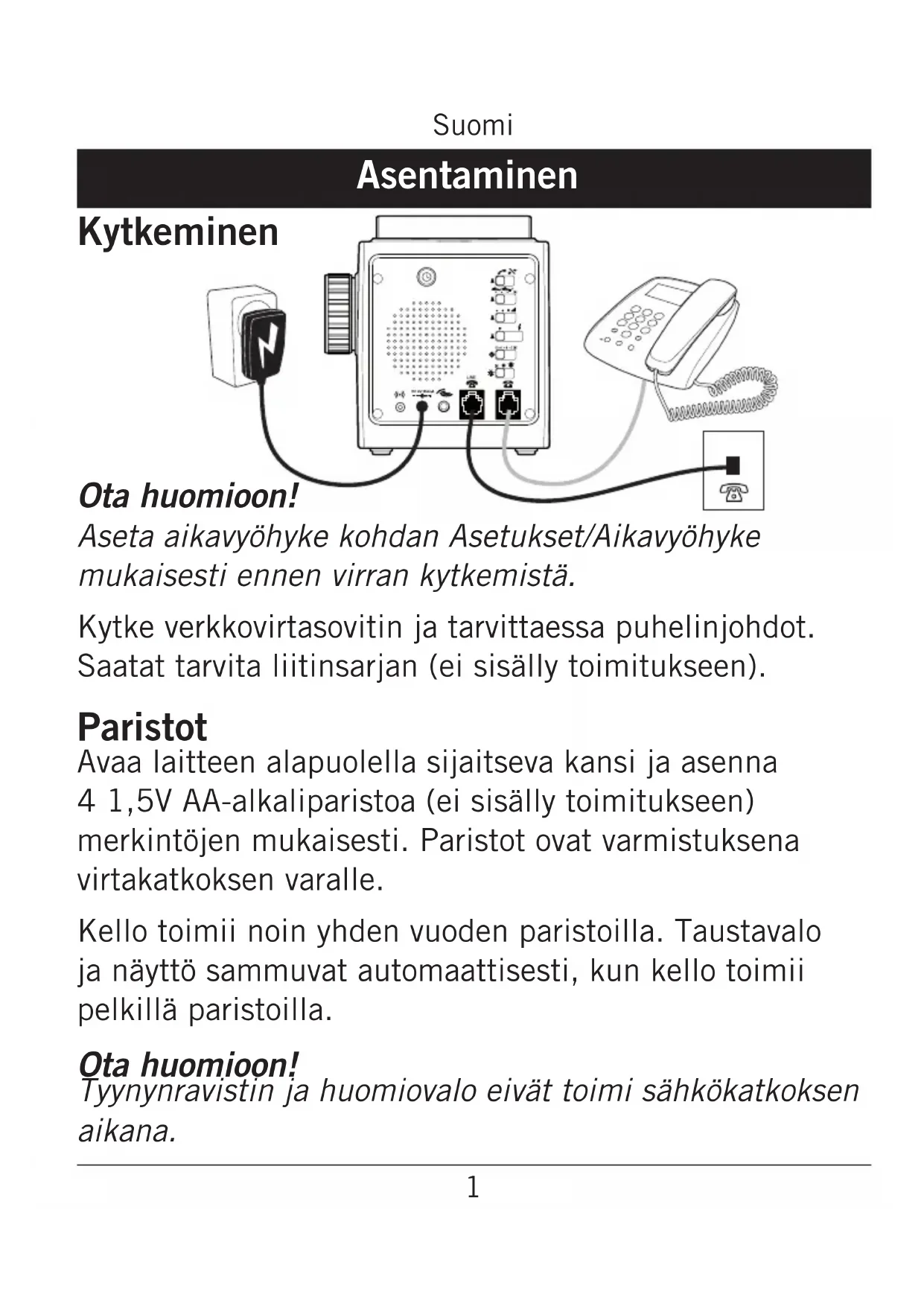 Hälytysääni Aikavyöhyke Kirkkaus Puhelinliitäntä Linjaliitäntä Väristinliitäntä Verkkovirtasovittimen liitäntä Ulkoisen hälyttimen liitäntä Kaiutin