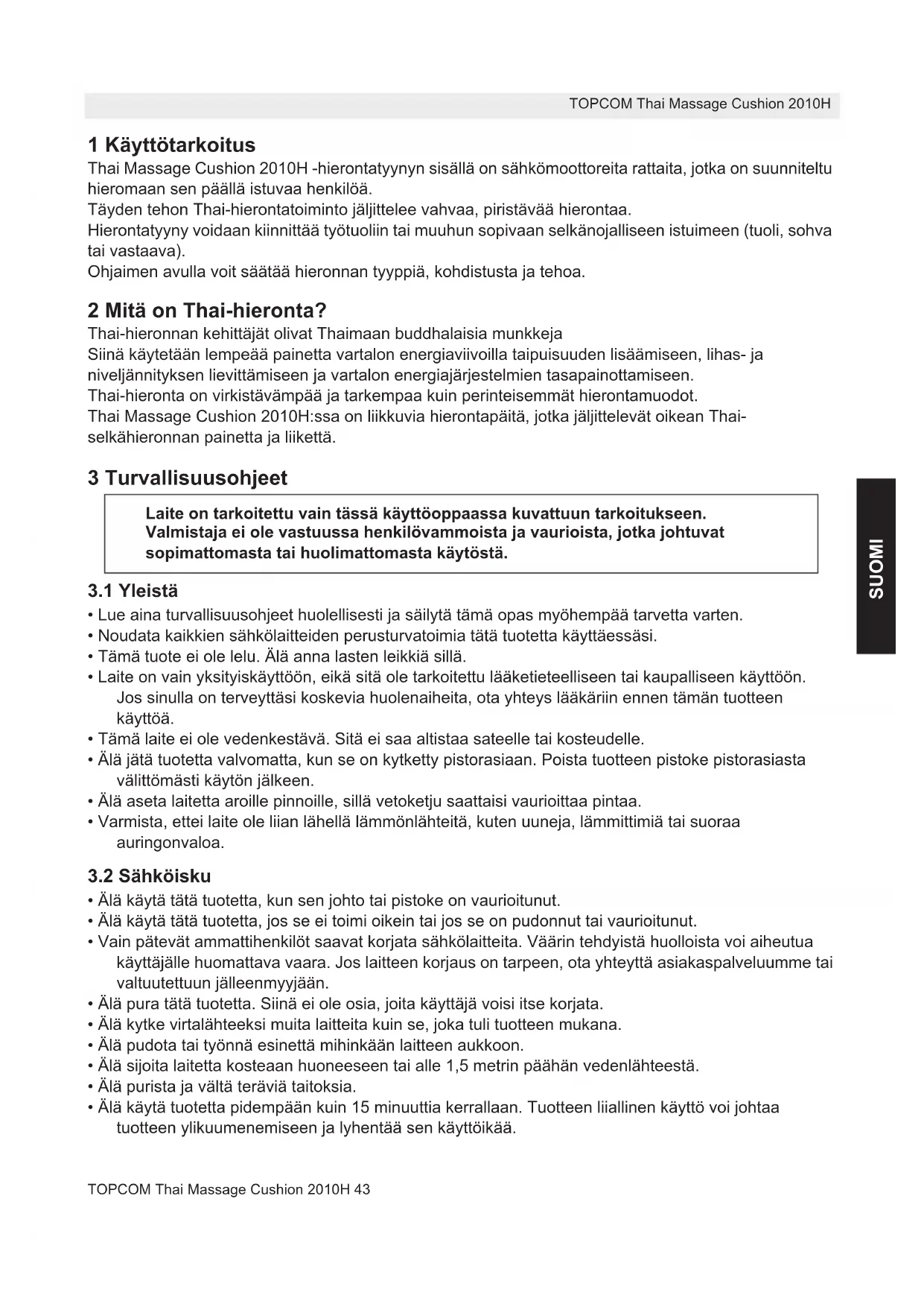 Feil eller mangler som skyldes feil håndtering eller bruk, og feil som skyldes bruk av uoriginale deler eller tilbehør som ikke er anbefalt av Topcom, dekkes ikke av garantien. Garantien dekker ikke skade forårsaket av ytre faktorer som lynnedslag, vann eller ild, eller skade som har oppstått under transport. Garantien er ikke gyldig hvis serienummeret på enheten er endret, fjernet eller gjort uleselig. Dette produktet oppfyller hovedkravene og andre relevante bestemmelser i direktivet 2004/108/EEC. Samsvarserklæring finnes på denne adressen: http://www.topcom.net/cedeclarations.php HL_TMC-2010H D164.book Page 42 Friday, May 29, 2009 9:30 AMTOPCOM Thai Massage Cushion 2010H 43 TOPCOM Thai Massage Cushion 2010H SUOMI 1 Käyttötarkoitus Thai Massage Cushion 2010H -hierontatyynyn sisällä on sähkömoottoreita rattaita, jotka on suunniteltu hieromaan sen päällä istuvaa henkilöä. Täyden tehon Thai-hierontatoiminto jäljittelee vahvaa, piristävää hierontaa. Hierontatyyny voidaan kiinnittää työtuoliin tai muuhun sopivaan selkänojalliseen istuimeen (tuoli, sohva tai vastaava). Ohjaimen avulla voit säätää hieronnan tyyppiä, kohdistusta ja tehoa. 2 Mitä on Thai-hieronta? Thai-hieronnan kehittäjät olivat Thaimaan buddhalaisia munkkeja Siinä käytetään lempeää painetta vartalon energiaviivoilla taipuisuuden lisäämiseen, lihas- ja niveljännityksen lievittämiseen ja vartalon energiajärjestelmien tasapainottamiseen. Thai-hieronta on virkistävämpää ja tarkempaa kuin perinteisemmät hierontamuodot. Thai Massage Cushion 2010H:ssa on liikkuvia hierontapäitä, jotka jäljittelevät oikean Thai- selkähieronnan painetta ja liikettä. 3 Turvallisuusohjeet
