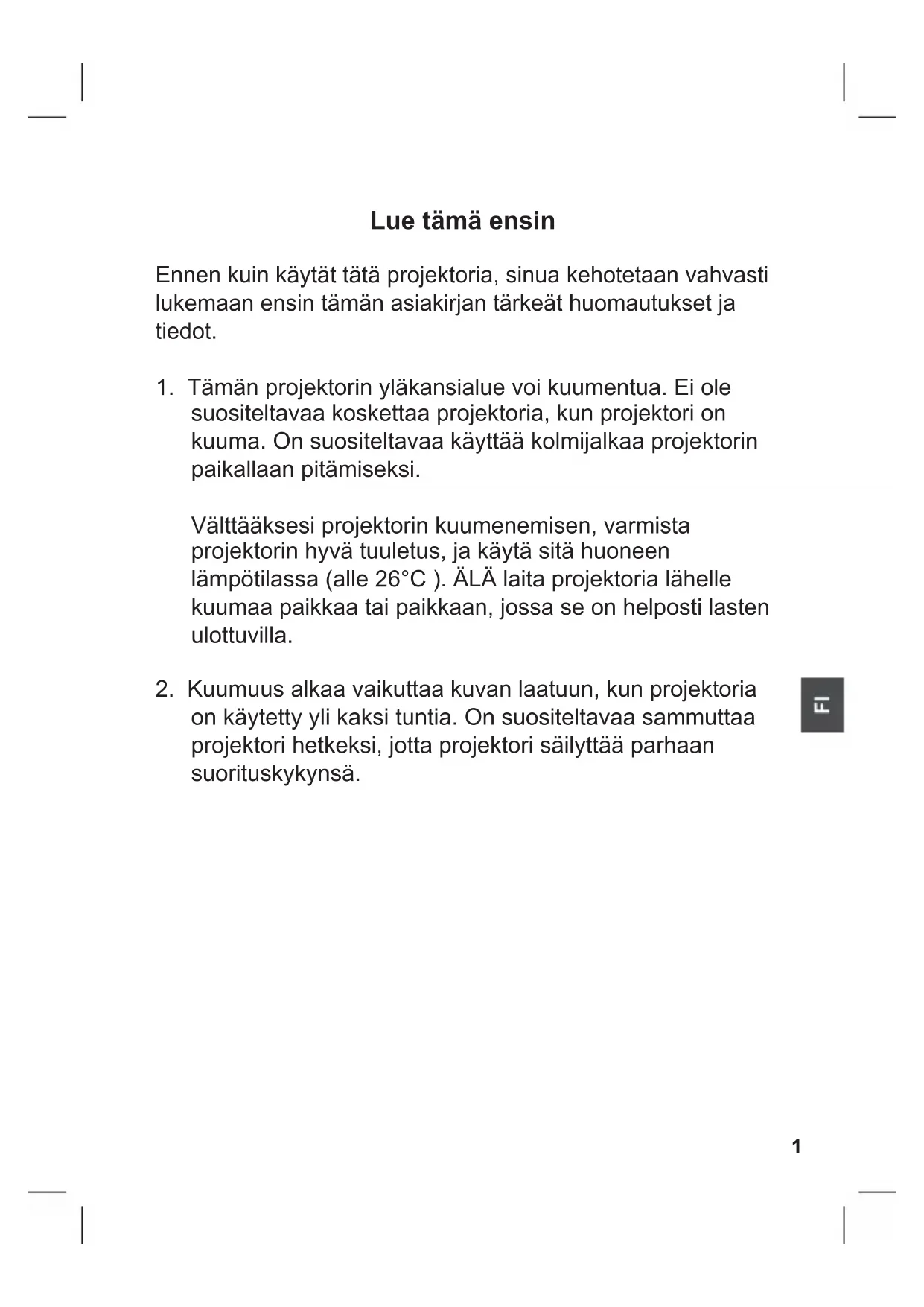 1. Tämän projektorin yläkansialue voi kuumentua. Ei ole