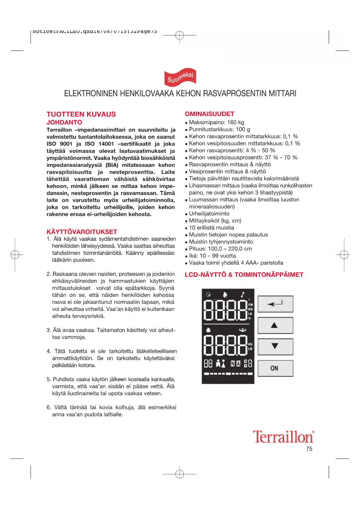TUOTTEEN KUVAUS JOHDANTO Terraillon –impedanssimittari on suunniteltu javalmistettu tuotantolaitoksessa, joka on saanutISO 9001 ja ISO 14001 –sertifikaatit ja jokatäyttää voimassa olevat laatuvaatimukset jaympäristönormit. Vaaka hyödyntää biosähköistäimpedanssianalyysiä (BIA) mitatessaan kehonrasvapitoisuutta ja nesteprosenttia. Laitelähettää vaarattoman vähäistä sähkövirtaakehoon, minkä jälkeen se mittaa kehon impe-danssin, nesteprosentin ja rasvamassan. Tämälaite on varustettu myös urheilijatoiminnolla,joka on tarkoitettu urheilijoille, joiden kehonrakenne eroaa ei-urheilijoiden kehosta. KÄYTTÖVAROITUKSET 1. Älä käytä vaakaa sydämentahdistimen saaneidenhenkilöiden läheisyydessä. Vaaka saattaa aiheuttaatahdistimen toimintahäiriöitä. Käänny epäillessäsilääkärin puoleen.2. Raskaana olevien naisten, proteesien ja joidenkinehkäisyvälineiden ja hammastukien käyttäjienmittaustulokset voivat olla epätarkkoja. Syynätähän on se, että näiden henkilöiden kehossarasva ei ole jakaantunut normaaliin tapaan, mikävoi aiheuttaa virheitä. Vaa’an käyttö ei kuitenkaanaiheuta terveysriskiä. 3. Älä avaa vaakaa. Taitamaton käsittely voi aiheut-taa vammoja.4. Tätä tuotetta ei ole tarkoitettu lääketieteelliseenammattikäyttöön. Se on tarkoitettu käytettäväksipelkästään kotona. 5. Puhdista vaaka käytön jälkeen kostealla kankaalla,varmista, että vaa’an sisään ei pääse vettä. Äläkäytä liuotinaineita tai upota vaakaa veteen.6. Vältä tärinää tai kovia kolhuja, älä esimerkiksianna vaa’an pudota lattialle. OMINAISUUDET
