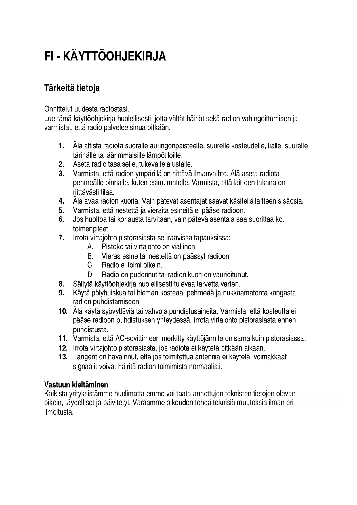 12. Irrota virtajohto pistorasiasta, jos radiota ei käytetä pitkään aikaan.