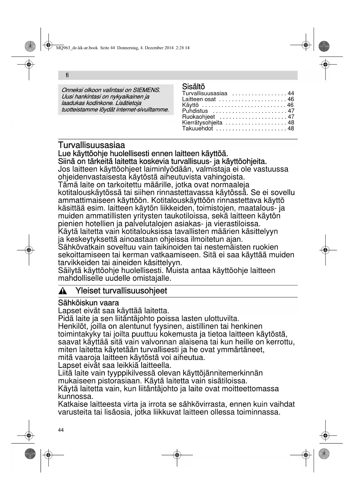tuotteistamme löydät internet-sivuiltamme. MQ963_de-kk-ar.book Seite 44 Donnerstag, 4. Dezember 2014 2:28 1445