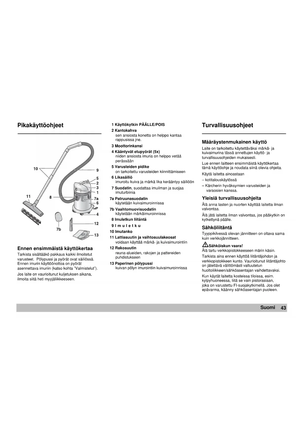 Vaara! Irrota verkkopistoke pistorasiasta aina ennen laitteen puhdistamista tai huoltotöitä. Imurin ja varusteiden puhdistus