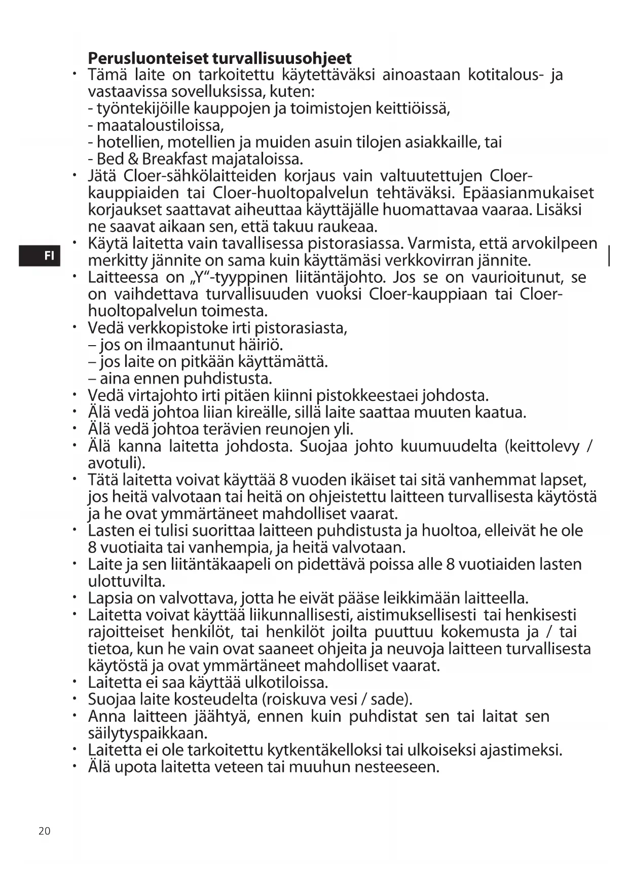 NL2020 Perusluonteiset turvallisuusohjeet Tämä laite on tarkoitettu käytettäväksi ainoastaan kotitalous- ja vastaavissa sovelluksissa, kuten: - työntekijöille kauppojen ja toimistojen keittiöissä, - maataloustiloissa, - hotellien, motellien ja muiden asuin tilojen asiakkaille, tai - Bed & Breakfast majataloissa. Jätä Cloer-sähkölaitteiden korjaus vain valtuutettujen Cloer- kauppiaiden tai Cloer-huoltopalvelun tehtäväksi. Epäasianmukaiset korjaukset saattavat aiheuttaa käyttäjälle huomattavaa vaaraa. Lisäksi ne saavat aikaan sen, että takuu raukeaa. Käytä laitetta vain tavallisessa pistorasiassa. Varmista, että arvokilpeen merkitty jännite on sama kuin käyttämäsi verkkovirran jännite. Laitteessa on „Y“-tyyppinen liitäntäjohto. Jos se on vaurioitunut, se on vaihdettava turvallisuuden vuoksi Cloer-kauppiaan tai Cloer- huoltopalvelun toimesta. Vedä verkkopistoke irti pistorasiasta, – jos on ilmaantunut häiriö. – jos laite on pitkään käyttämättä. – aina ennen puhdistusta. Vedä virtajohto irti pitäen kiinni pistokkeestaei johdosta. Älä vedä johtoa liian kireälle, sillä laite saattaa muuten kaatua. Älä vedä johtoa terävien reunojen yli. Älä kanna laitetta johdosta. Suojaa johto kuumuudelta (keittolevy / avotuli). Tätä laitetta voivat käyttää 8 vuoden ikäiset tai sitä vanhemmat lapset, jos heitä valvotaan tai heitä on ohjeistettu laitteen turvallisesta käytöstä ja he ovat ymmärtäneet mahdolliset vaarat. Lasten ei tulisi suorittaa laitteen puhdistusta ja huoltoa, elleivät he ole 8 vuotiaita tai vanhempia, ja heitä valvotaan. Laite ja sen liitäntäkaapeli on pidettävä poissa alle 8 vuotiaiden lasten ulottuvilta. Lapsia on valvottava, jotta he eivät pääse leikkimään laitteella. Laitetta voivat käyttää liikunnallisesti, aistimuksellisesti tai henkisesti rajoitteiset henkilöt, tai henkilöt joilta puuttuu kokemusta ja / tai tietoa, kun he vain ovat saaneet ohjeita ja neuvoja laitteen turvallisesta käytöstä ja ovat ymmärtäneet mahdolliset vaarat. Laitetta ei saa käyttää ulkotiloissa. Suojaa laite kosteudelta (roiskuva vesi / sade). Anna laitteen jäähtyä, ennen kuin puhdistat sen tai laitat sen säilytyspaikkaan. Laitetta ei ole tarkoitettu kytkentäkelloksi tai ulkoiseksi ajastimeksi. Älä upota laitetta veteen tai muuhun nesteeseen.