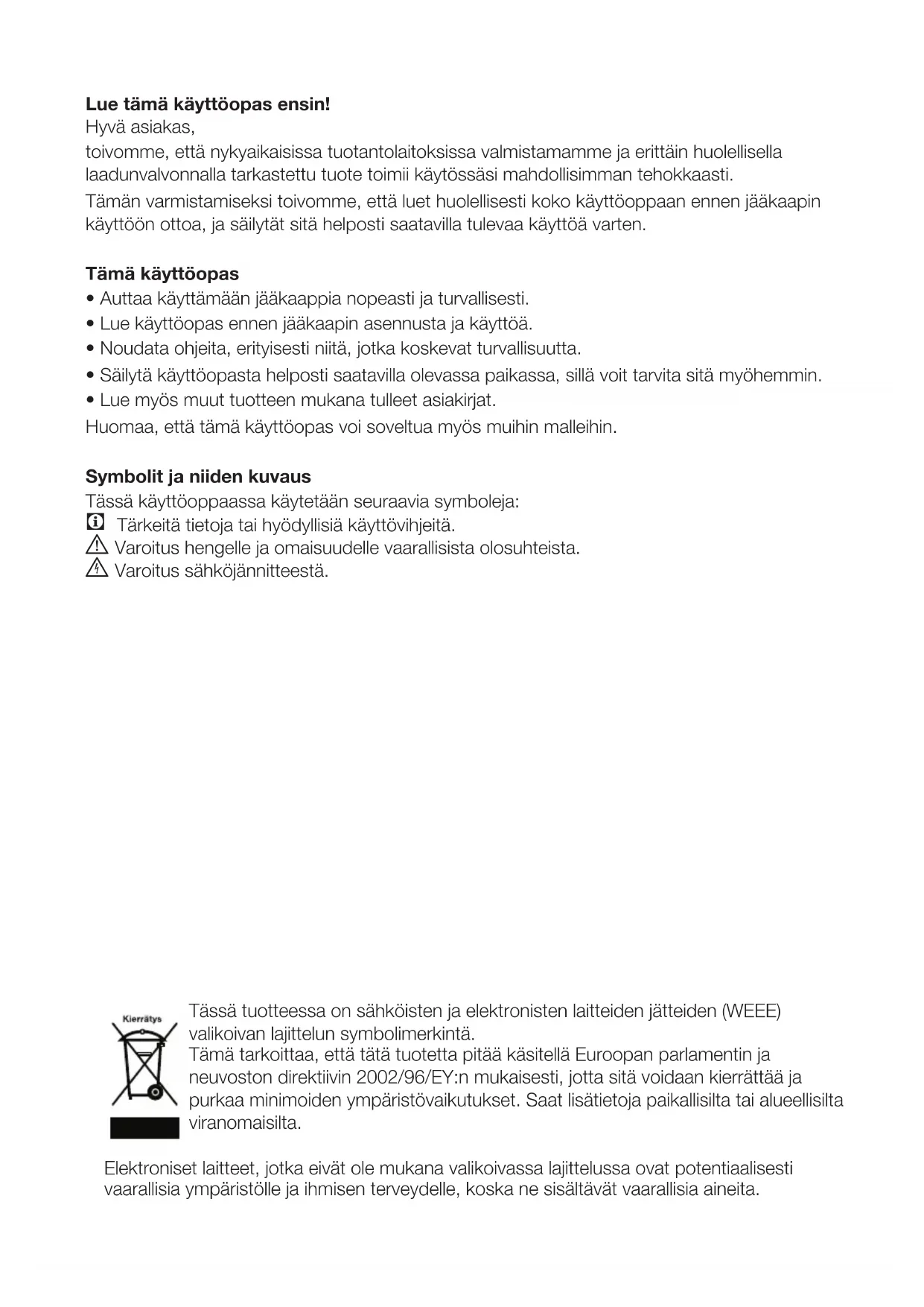 - Lue käyttöopas ennen jääkaapin asennusta ja käyttöä.