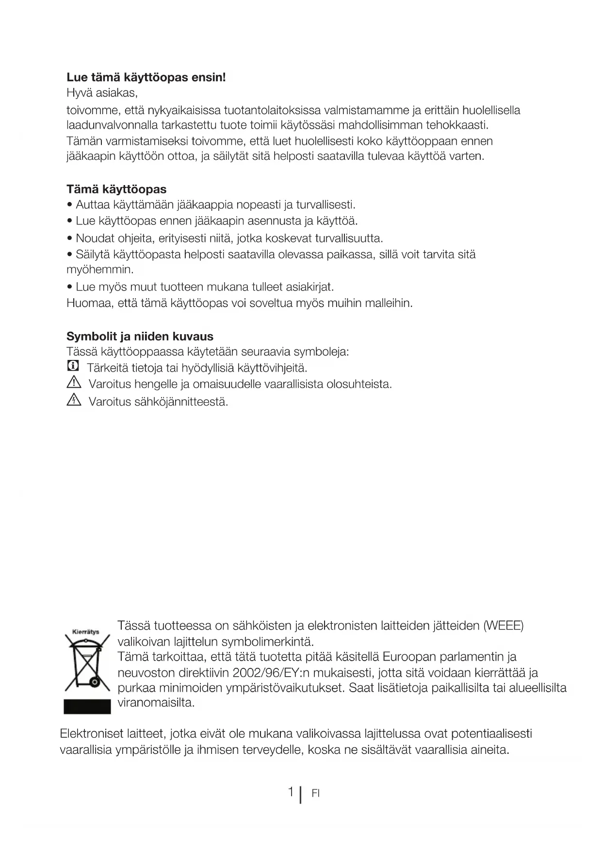 - Lue käyttöopas ennen jääkaapin asennusta ja käyttöä.