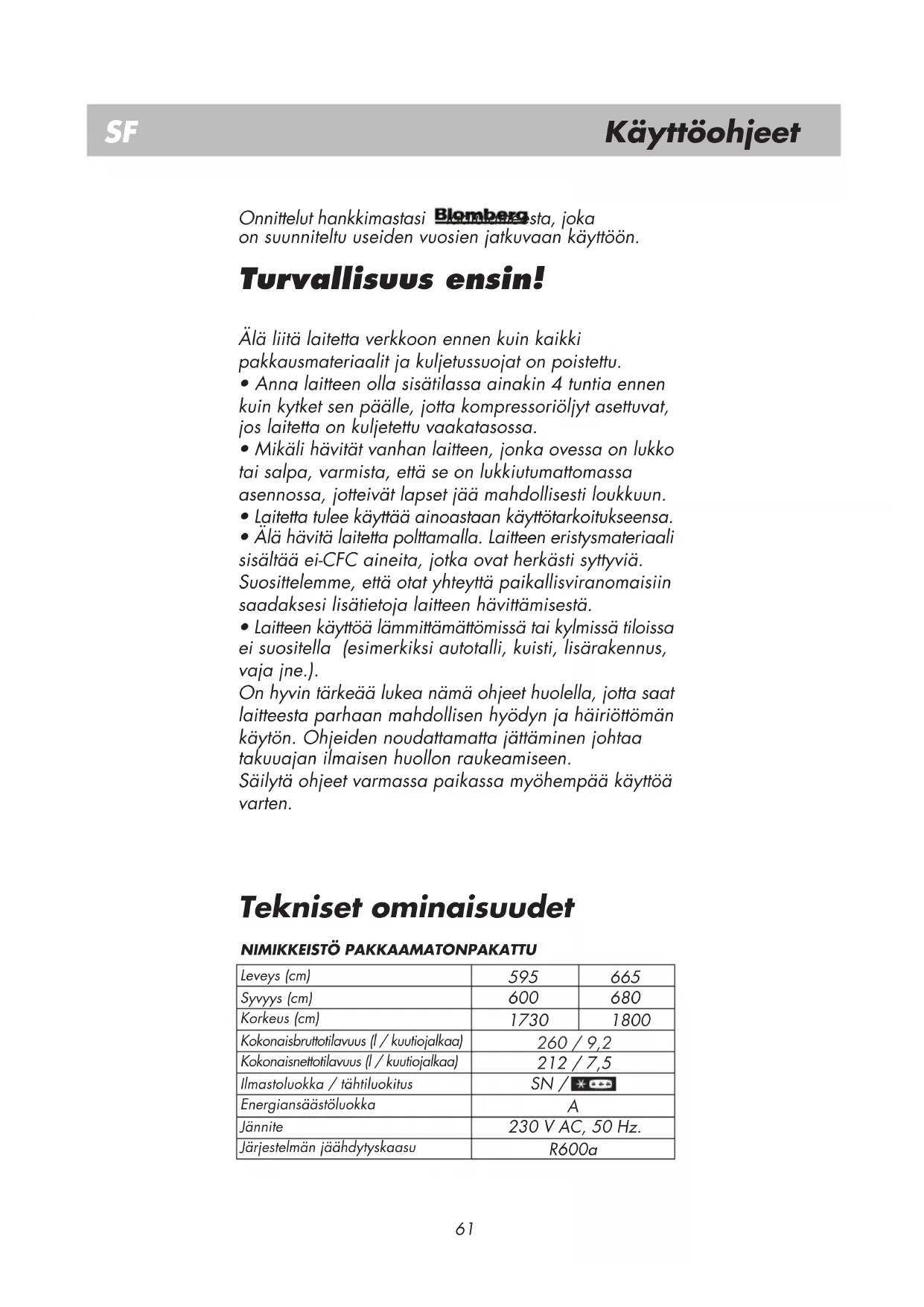 - Laitteen käyttöä lämmittämättömissä tai kylmissä tiloissa ei suositella (esimerkiksi autotalli, kuisti, lisärakennus, vaja jne.). On hyvin tärkeää lukea nämä ohjeet huolella, jotta saat laitteesta parhaan mahdollisen hyödyn ja häiriöttömän käytön. Ohjeiden noudattamatta jättäminen johtaa takuuajan ilmaisen huollon raukeamiseen. Säilytä ohjeet varmassa paikassa myöhempää käyttöä varten. Onnittelut hankkimastasi laatulaitteesta, joka on suunniteltu useiden vuosien jatkuvaan käyttöön. Tekniset ominaisuudet Leveys (cm) Syvyys (cm) Korkeus (cm) Kokonaisbruttotilavuus (l / kuutiojalkaa) Kokonaisnettotilavuus (l / kuutiojalkaa) Ilmastoluokka / tähtiluokitus Energiansäästöluokka Jännite Järjestelmän jäähdytyskaasu
