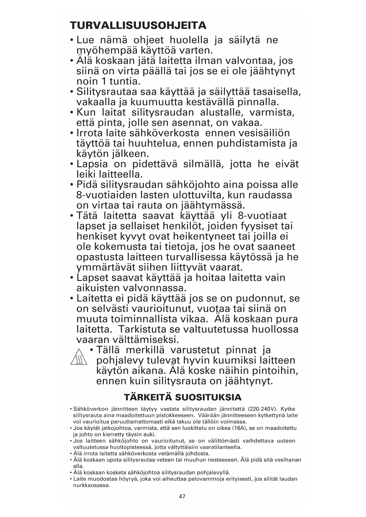• Silitysrautaa saa käyttää ja säilyttää tasaisella,