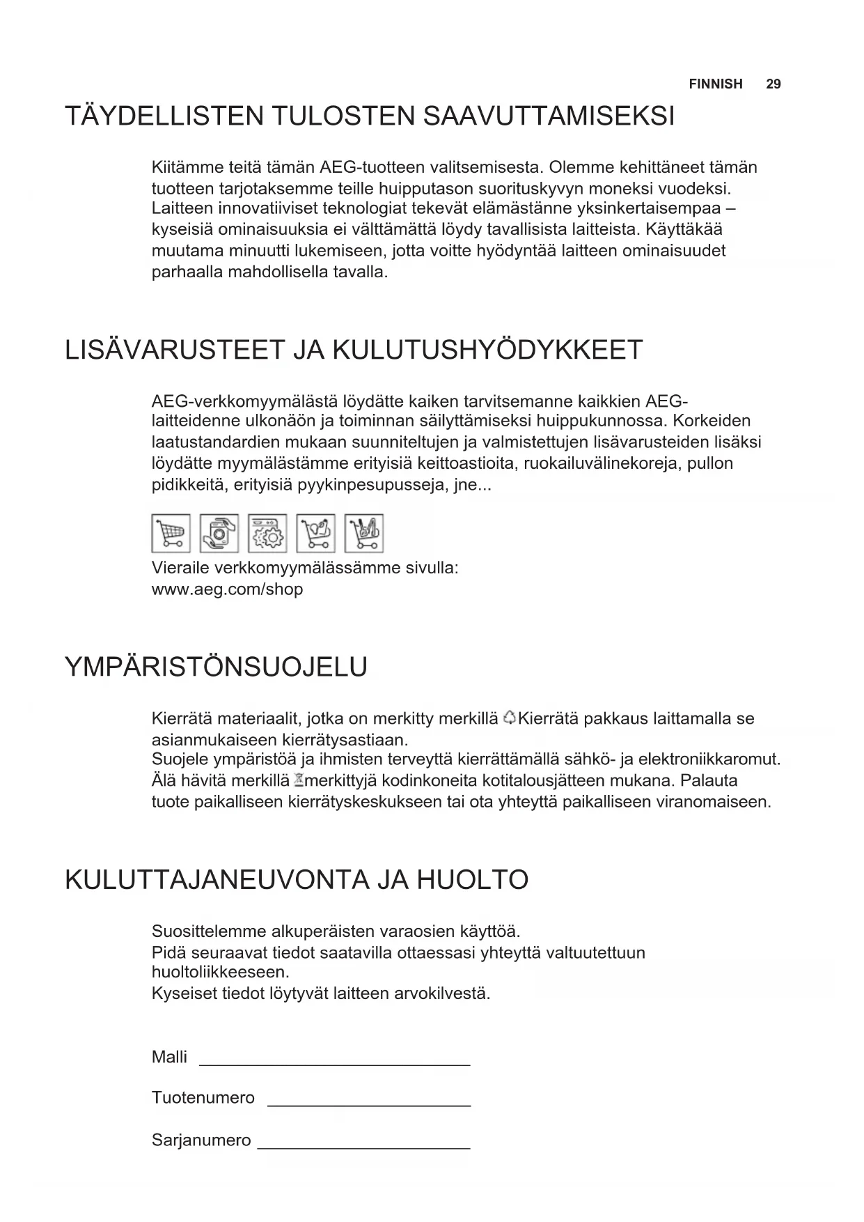 FINNISH TÄYDELLISTEN TULOSTEN SAAVUTTAMISEKSI Kiitämme teitä tämän AEG-tuotteen valitsemisesta. Olemme kehittäneet tämän