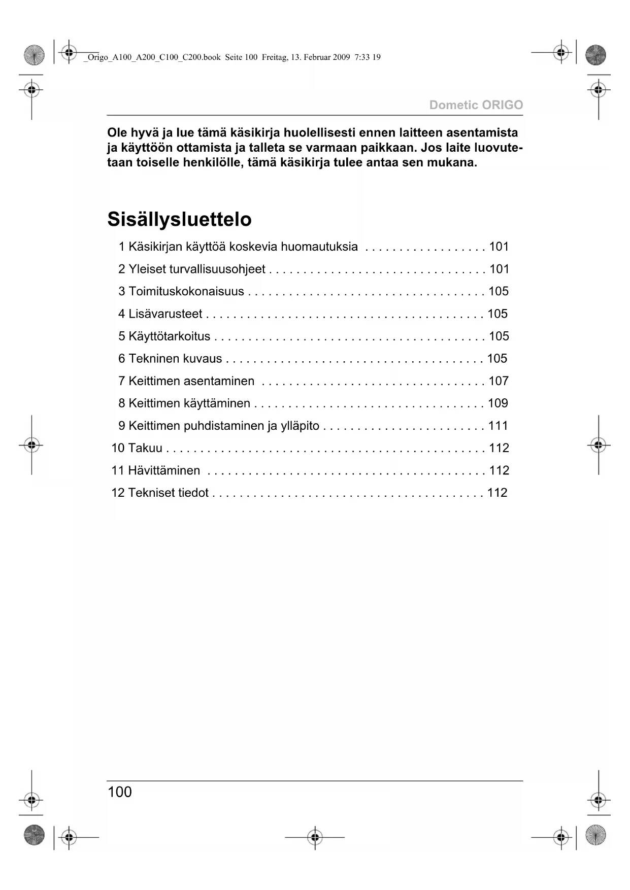 _Origo_A100_A200_C100_C200.book Seite 100 Freitag, 13. Februar 2009 7:33 19Dometic ORIGO Käsikirjan käyttöä koskevia huomautuksia