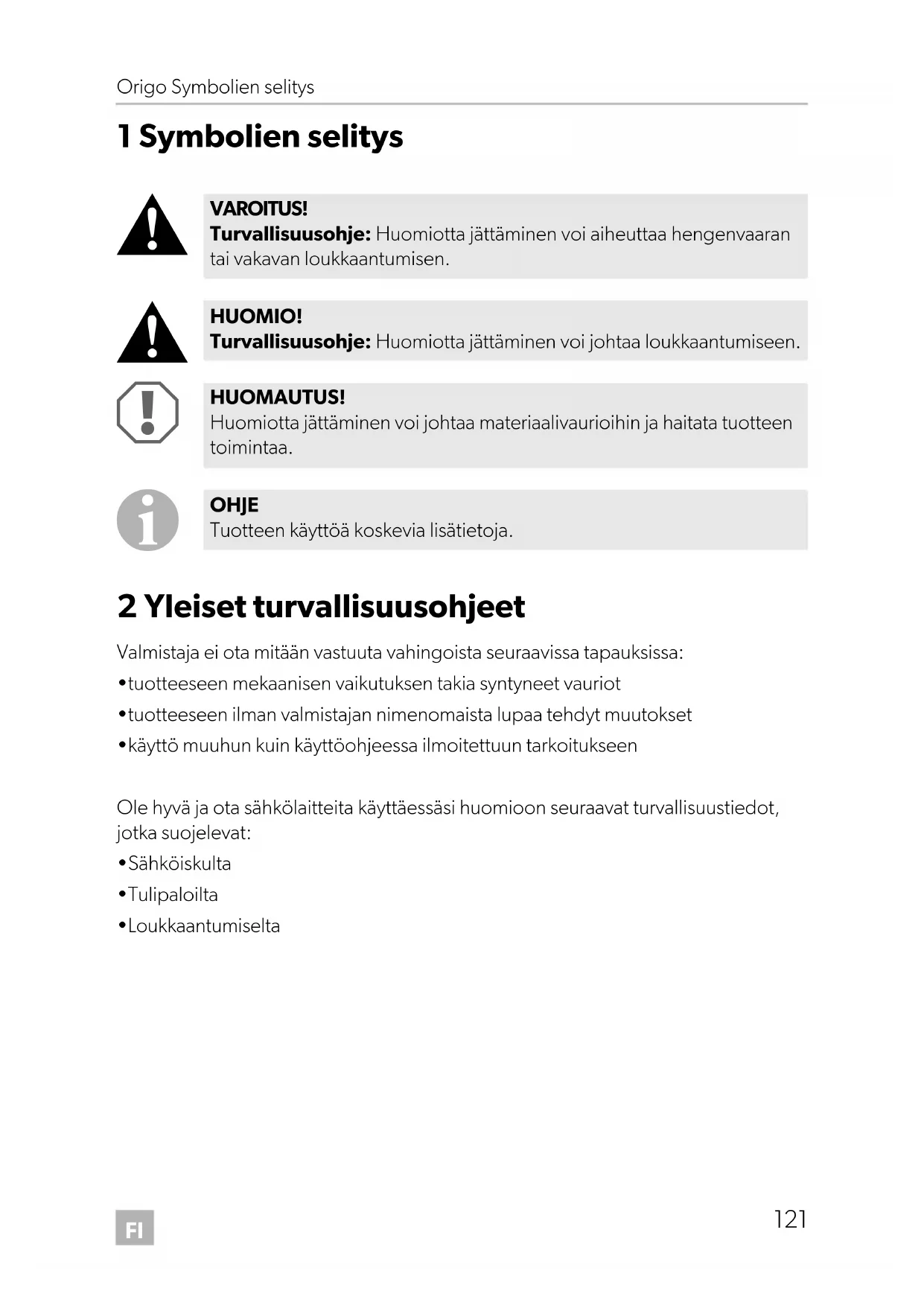 Origo_2000_4100.book Seite 121 Freitag, 6. Januar 2017 11:40 11FI Yleiset turvallisuusohjeet Origo