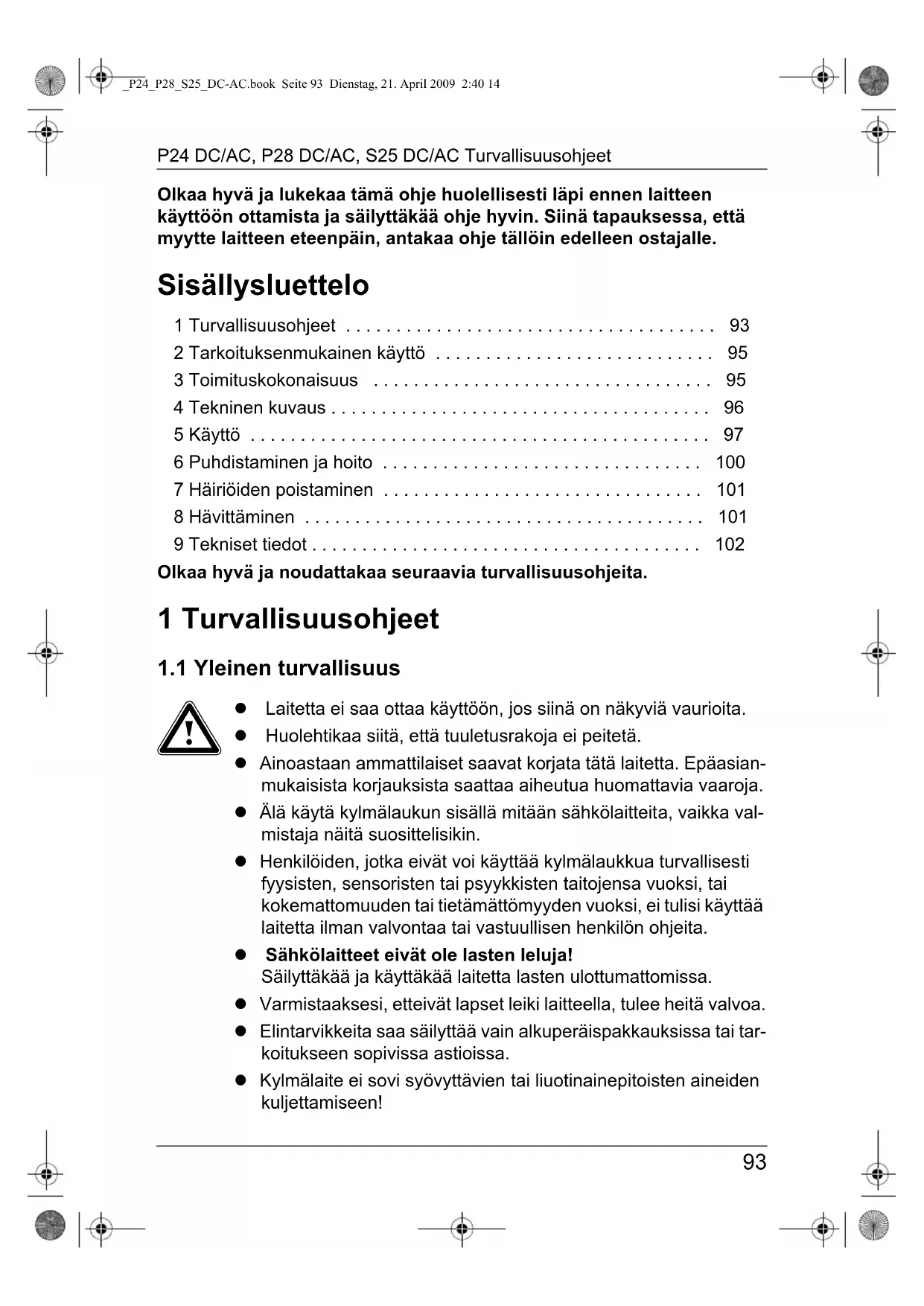 _P24_P28_S25_DC-AC.book Seite 94 Dienstag, 21. April 2009 2:40 14P24 DC/AC, P28 DC/AC, S25 DC/AC Tarkoituksenmukainen käyttö