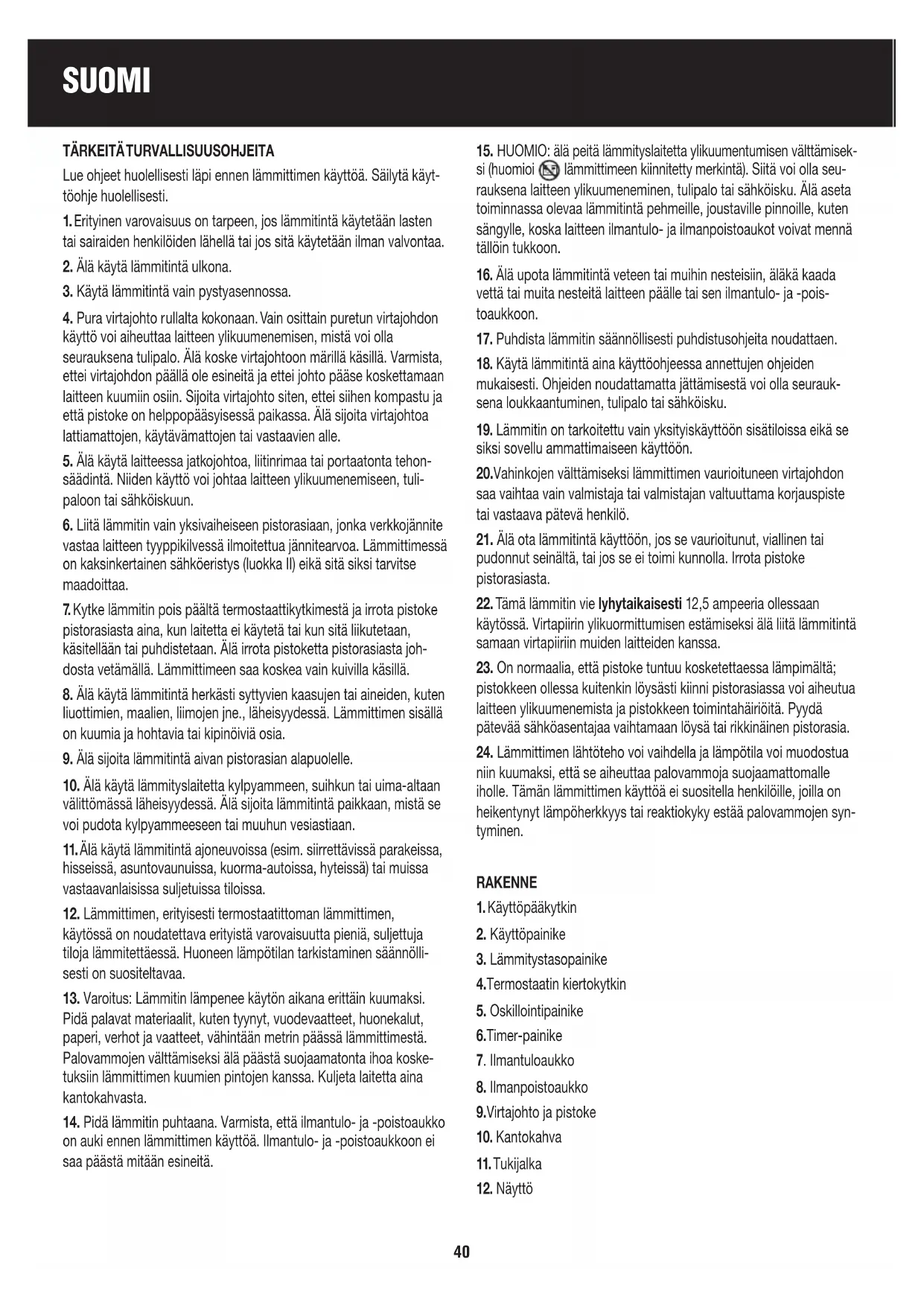 13. Varoitus: Lämmitin lämpenee käytön aikana erittäin kuumaksi.