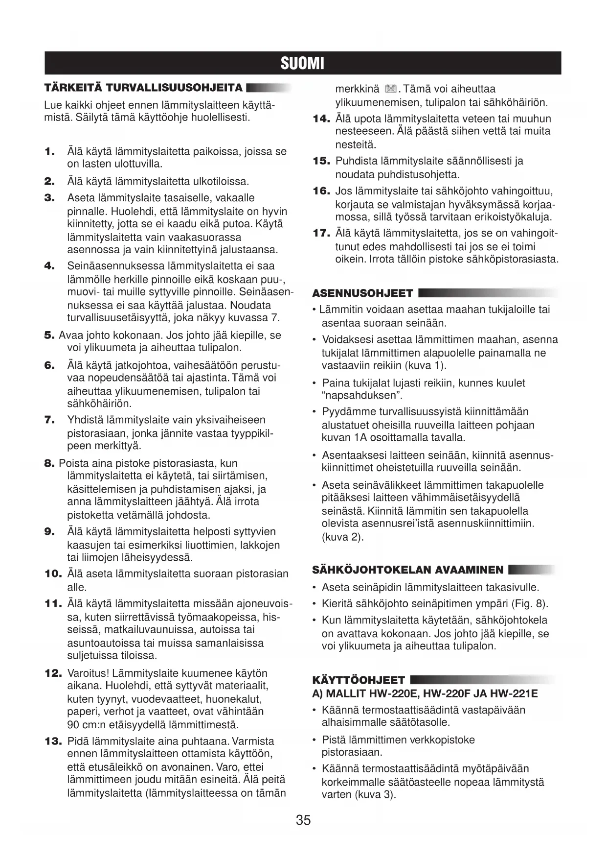 KÄYTTÖOHJEET A) MALLIT HW-220E, HW-220F JA HW-221E