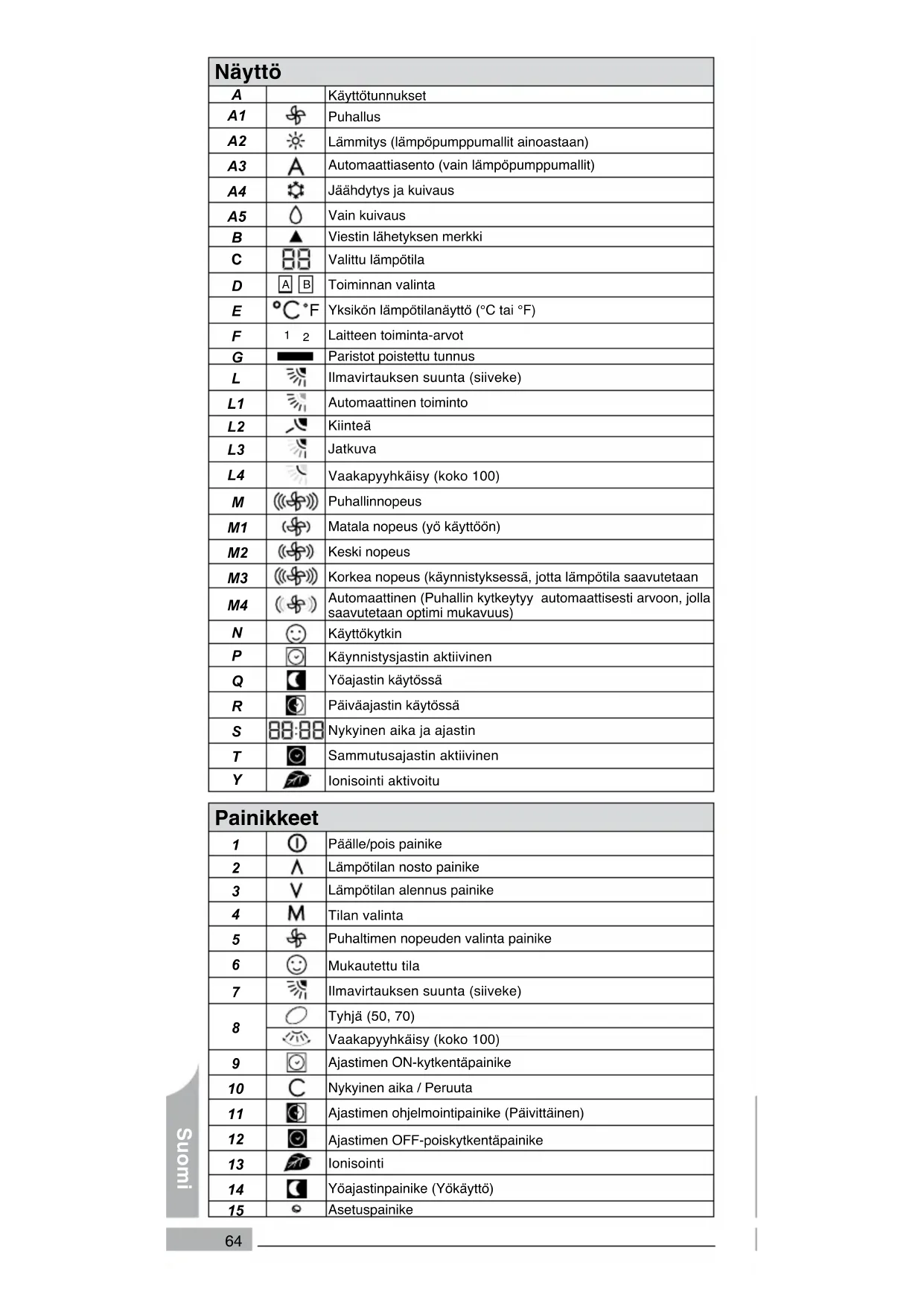 Päälle/pois painike Lämpötilan nosto painike Lämpötilan alennus painike Tilan valinta Puhaltimen nopeuden valinta painike Mukautettu tila Ilmavirtauksen suunta (siiveke) Tyhjä (50, 70)Vaakapyyhkäisy (koko 100) Ajastimen ON-kytkentäpainike Nykyinen aika / Peruuta Ajastimen ohjelmointipainike (Päivittäinen) Ajastimen OFF-poiskytkentäpainike Ionisointi Yöajastinpainike (Yökäyttö) Asetuspainike Suomi65