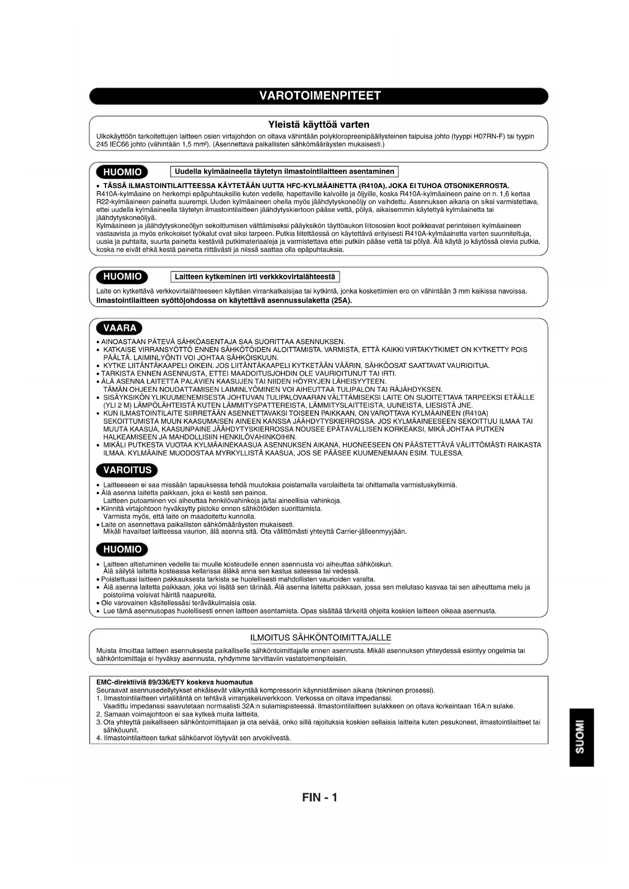 - Älä asenna laitetta paikkaan, joka ei kestä sen painoa.Laitteen putoaminen voi aiheuttaa henkilövahinkoja ja/tai aineellisia vahinkoja.• Kiinnitä virtajohtoon hyväksytty pistoke ennen sähkötöiden suorittamista.Varmista myös, että laite on maadoitettu kunnolla.• Laite on asennettava paikallisten sähkömääräysten mukaisesti.Mikäli havaitset laitteessa vaurion, älä asenna sitä. Ota välittömästi yhteyttä Carrier-jälleenmyyjään. HUOMIO