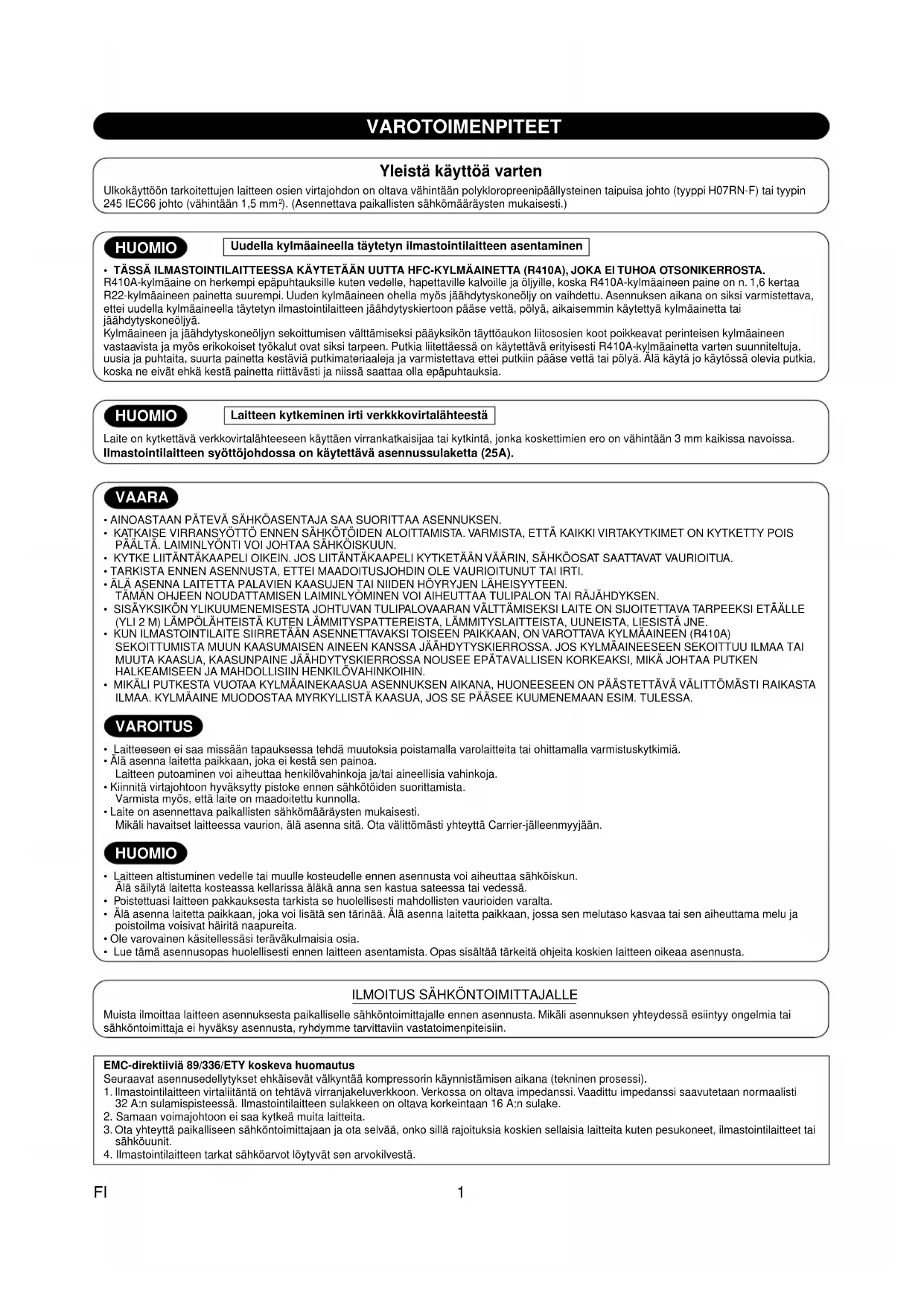 Muista ilmoittaa laitteen asennuksesta paikalliselle sähköntoimittajalle ennen asennusta. Mikäli asennuksen yhteydessä esiintyy ongelmia tai sähköntoimittaja ei hyväksy asennusta, ryhdymme tarvittaviin vastatoimenpiteisiin.EMC-direktiiviä 89/336/ETY koskeva huomautusSeuraavat asennusedellytykset ehkäisevät välkyntää kompressorin käynnistämisen aikana (tekninen prosessi). 1. Ilmastointilaitteen virtaliitäntä on tehtävä virranjakeluverkkoon. Verkossa on oltava impedanssi. Vaadittu impedanssi saavutetaan normaalisti 32 A:n sulamispisteessä. Ilmastointilaitteen sulakkeen on oltava korkeintaan 16 A:n sulake.2. Samaan voimajohtoon ei saa kytkeä muita laitteita. 3. Ota yhteyttä paikalliseen sähköntoimittajaan ja ota selvää, onko sillä rajoituksia koskien sellaisia laitteita kuten pesukoneet, ilmastointilaitteet tai sähköuunit.4. Ilmastointilaitteen tarkat sähköarvot löytyvät sen arvokilvestä. VAARA
