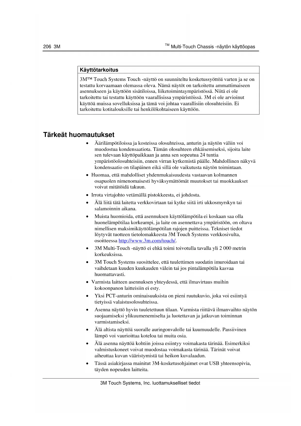 Multi-Touch Chassis -näytön käyttöopas 3M Touch Systems, Inc. luottamukselliset tiedot Käyttötarkoitus 3M™ Touch Systems Touch -näyttö on suunniteltu kosketussyöttöä varten ja se on testattu korvaamaan olemassa oleva. Nämä näytöt on tarkoitettu ammattimaiseen asennukseen ja käyttöön sisätiloissa, liiketoimintaympäristössä. Niitä ei ole tarkoitettu tai testattu käyttöön vaarallisissa ympäristöissä. 3M ei ole arvioinut käyttöä muissa sovelluksissa ja tämä voi johtaa vaarallisiin olosuhteisiin. Ei tarkoitettu kotitalouksille tai henkilökohtaiseen käyttöön.