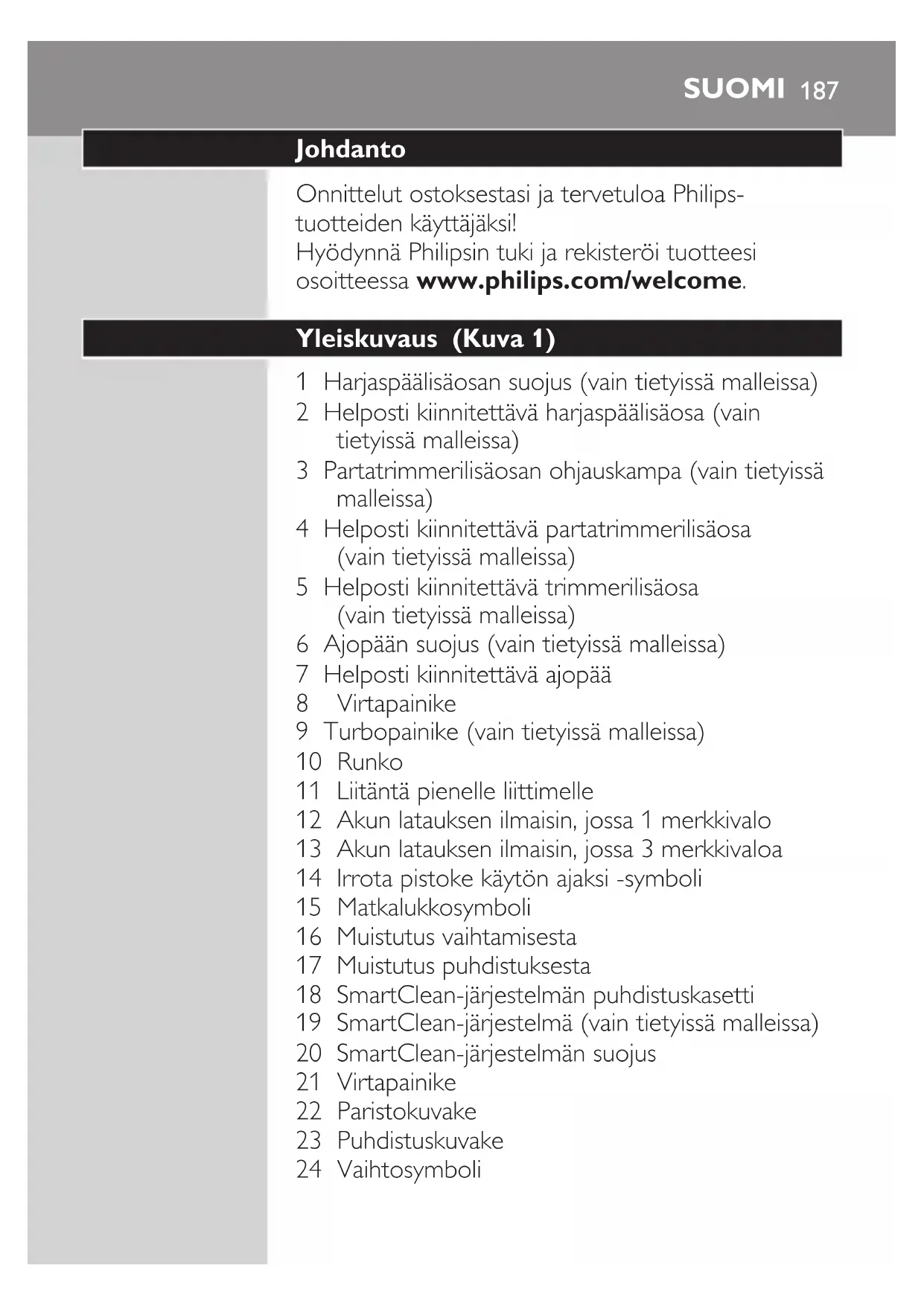 3 Huuhtele ajopää juoksevalla vedellä, jotta se liukuu tasaisesti iholla. 4 Kytke parranajokoneeseen virta. 5 Liikuta ajopäitä iholla pyörivin liikkein. Huomautus: Huuhtele parranajokone säännöllisesti juoksevalla vedellä, jotta se liukuu edelleen tasaisesti iholla. 6 Kuivaa kasvot ja puhdista parranajokone huolellisesti jokaisen käytön jälkeen (katso kohta Puhdistus ja huolto). SUOMI196Huomautus: Huuhtele kaikki vaahto tai parranajogeeli parranajokoneesta. Turbo-asetus (vain tietyissä malleissa) Laitteessa on Turbo- tai Turbo+-asetus, joka helpottaa hankalien alueiden käsittelyä. 1 Kytke parranajokoneeseen virta. 2 Käynnistä Turbo-asetus painamalla kerran Turbo-painiketta. Turbo-asetus nopeuttaa hankalien alueiden käsittelyä. 3 Liikuta ajopäitä iholla pyörivin liikkein. Huomautus: Älä tee suoria liikkeitä. 4 Voit poistaa turboasetuksen käytöstä painamalla kerran Turbo-painiketta. Helposti kiinnitettävien lisäosien käyttäminen Huomautus: Laitteen mukana toimitetut lisätarvikkeet vaihtelevat tuotteen mukaan. Tämän laitteen mukana toimitetut lisävarusteet näkyvät laatikossa. Paikalleen napsautettavien lisäosien poistaminen ja kiinnittäminen 1 Varmista, että laitteesta on katkaistu virta. 2 Vedä lisäosa irti laitteesta. Huomautus: Älä käännä ajopäätä vetäessäsi sitä pois laitteesta. SUOMI 1973 Aseta lisäosan kieleke laitteen päällä olevaan aukkoon. Kiinnitä sitten lisäosa laitteeseen painamalla sitä alaspäin, kunnes kuulet napsahduksen. Trimmeripään käyttäminen Voit käyttää trimmeripäätä pulisonkien ja viiksien siistimiseen. 1 Varmista, että laitteesta on katkaistu virta. 2 Aseta lisäosan kieleke parranajokoneen päällä olevaan aukkoon. Kiinnitä sitten trimmerilisäosa parranajokoneeseen painamalla sitä alaspäin, kunnes kuulet napsahduksen. 3 Käynnistä laite. 4 Voit nyt aloittaa trimmaamisen. 5 Puhdista lisäosa käytön jälkeen (katso kohta Puhdistus ja huolto). Partatrimmerin käyttäminen 1 Varmista, että laitteesta on katkaistu virta. 2 Aseta lisäosan kieleke laitteen päällä olevaan aukkoon. Kiinnitä sitten lisäosa laitteeseen painamalla sitä alaspäin, kunnes kuulet napsahduksen. Partatrimmerin käyttäminen ohjauskamman kanssa Voit liittää partatrimmerilisäosaan ohjauskamman, jolloin voit muotoilla parran haluamaasi pituuteen. Voit myös trimmata pitkät partakarvat ennen parranajoa, jolloin parranajo on miellyttävämpää. Voit valita partatrimmerilisäosan leikkauspituudeksi 1–5 mm. SUOMI1981 Liu’uta ohjauskampa suoraan lisäosan kummallakin puolella oleviin uriin niin, että se napsahtaa paikalleen. 2 Paina pituuden valitsinta ja valitse haluamasi pituusasetus siirtämällä valitsinta oikealle tai vasemmalle. 3 Käynnistä laite. 4 Voit nyt aloittaa parran muotoilun siirtämällä lisäosaa ylöspäin hellävaroen niin, että kampa koskettaa koko ajan ihoa. 5 Puhdista lisäosa käytön jälkeen (katso kohta Puhdistus ja huolto). Partatrimmerin käyttäminen ilman ohjauskampaa Ilman ohjauskampaa partatrimmeriä voi käyttää parran, viiksien, pulisonkien ja kaulan rajojen siistimiseen 0,5 mm:n pituuteen. 1 Vedä ohjauskampa lisäosasta. Huomautus: Vedä ohjauskampa irti lisäosasta tarttumalla kamman keskiosaan. Älä vedä ohjauskamman sivuista. 2 Käynnistä laite.