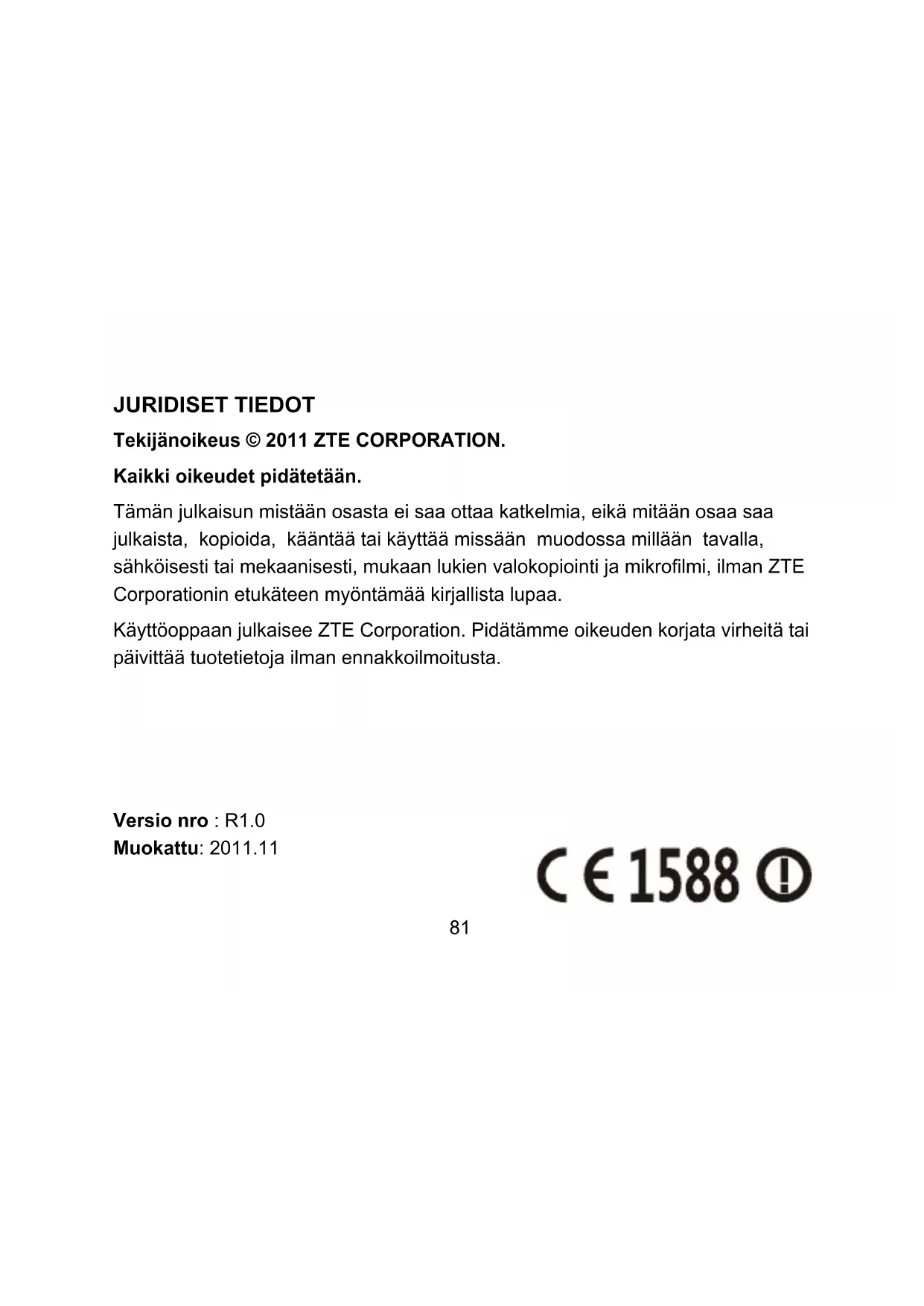 Απενεργοποιήστε τη συσκευή όταν βρίσκεστε σε περιβάλλον με κίνδυνο έκρηξης. Μην βασίζεστε σε αυτή τη συσκευή για επικοινωνίες έκτακτης ανάγκης. Χρησιμοποιείτε μόνο εγκεκριμένα εξαρτήματα.80 V9A Pikaopas81 JURIDISET TIEDOT Tekijänoikeus © 2011 ZTE CORPORATION. Kaikki oikeudet pidätetään. Tämän julkaisun mistään osasta ei saa ottaa katkelmia, eikä mitään osaa saa julkaista, kopioida, kääntää tai käyttää missään muodossa millään tavalla, sähköisesti tai mekaanisesti, mukaan lukien valokopiointi ja mikrolmi, ilman ZTE Corporationin etukäteen myöntämää kirjallista lupaa. Käyttöoppaan julkaisee ZTE Corporation. Pidätämme oikeuden korjata virheitä tai päivittää tuotetietoja ilman ennakkoilmoitusta. Versio nro : R1.0 Muokattu: 2011.1182 Yleistiedot Kaiutin Kuulokeliitäntä Takakansi Kosketus- näyttö Takakameran Kaiutin ValikkonäppäinPäänäkymäpainike Paluunäppäin Etuosan kamera Valo- anturi Ilmaisin Laturi-/ USB-liitäntä Virta- näppäin Äänenvoi- makkuuden säätöpainikkeet83 Ennen käytön aloittamista Tarkempia tietoja on käyttöoppaassa, joka on tallennettu valmiiksi asennetulle microSD-kortille.