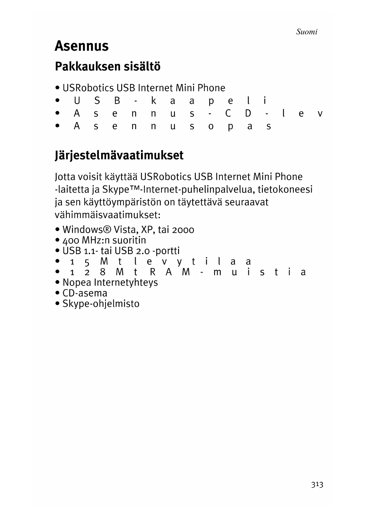 - Asennusopas Järjestelmävaatimukset Jotta voisit käyttää USRobotics USB Internet Mini Phone -laitetta ja Skype™-Internet-puhelinpalvelua, tietokoneesi ja sen käyttöympäristön on täytettävä seuraavat vähimmäisvaatimukset:
