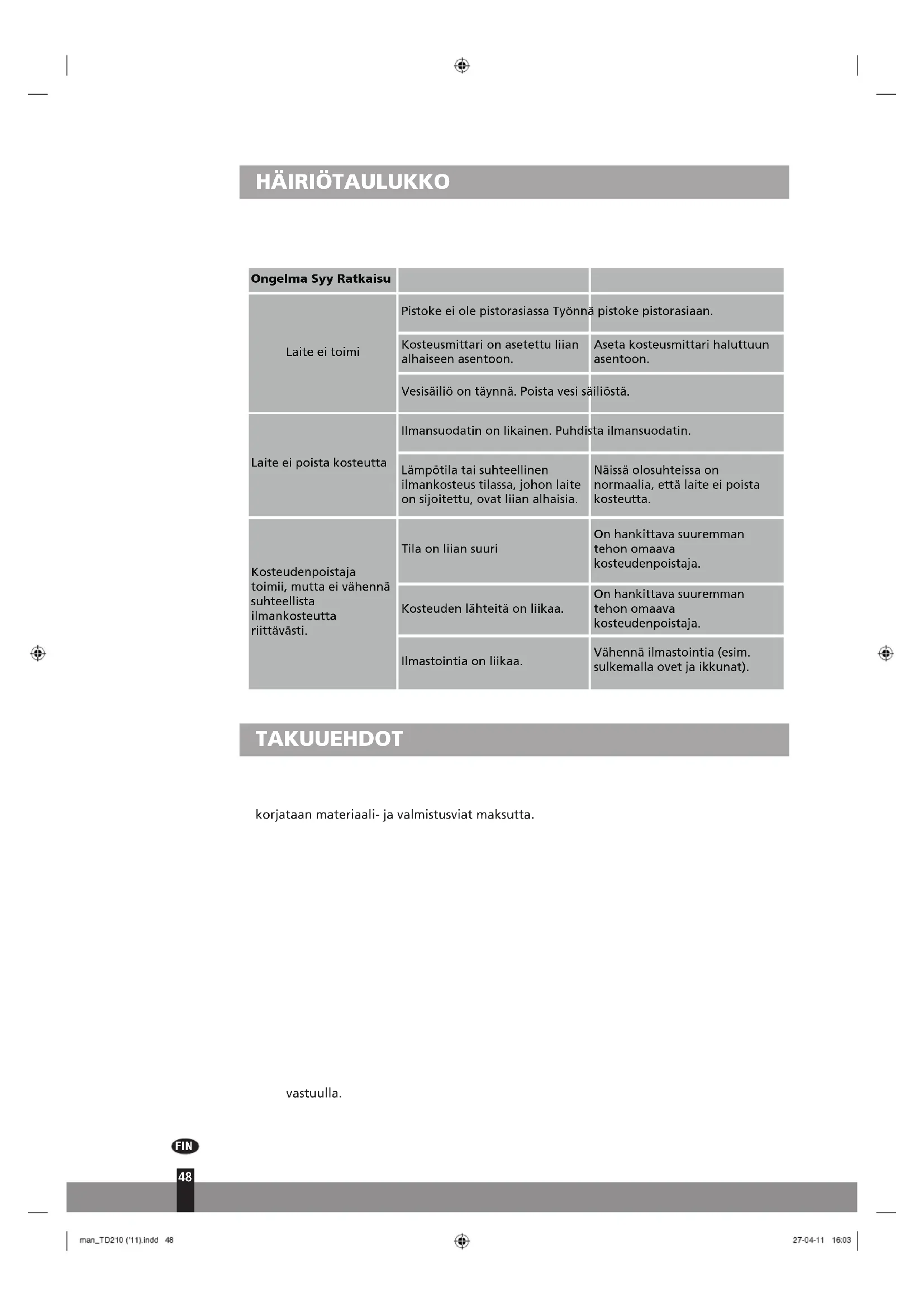 Ongelma Syy Ratkaisu Pistoke ei ole pistorasiassa Työnnä pistoke pistorasiaan. Kosteusmittari on asetettu liian alhaiseen asentoon. Aseta kosteusmittari haluttuun asentoon. Vesisäiliö on täynnä. Poista vesi säiliöstä. Ilmansuodatin on likainen. Puhdista ilmansuodatin. Lämpötila tai suhteellinen ilmankosteus tilassa, johon laite on sijoitettu, ovat liian alhaisia. Näissä olosuhteissa on normaalia, että laite ei poista kosteutta. Tila on liian suuri On hankittava suuremman tehon omaava kosteudenpoistaja. Kosteuden lähteitä on liikaa. On hankittava suuremman tehon omaava kosteudenpoistaja. Ilmastointia on liikaa. Vähennä ilmastointia (esim. sulkemalla ovet ja ikkunat). Laite ei poista kosteutta Kosteudenpoistaja toimii, mutta ei vähennä suhteellista ilmankosteutta riittävästi. Laite ei toimi TAKUUEHDOT +OSTEUDENPOISTAJANTAKUUONKAKSIVUOTTAOSTOPÊIVÊSTÊLÊHTIEN4ÊMÊNAJANKULUESSA korjataan materiaali- ja valmistusviat maksutta.