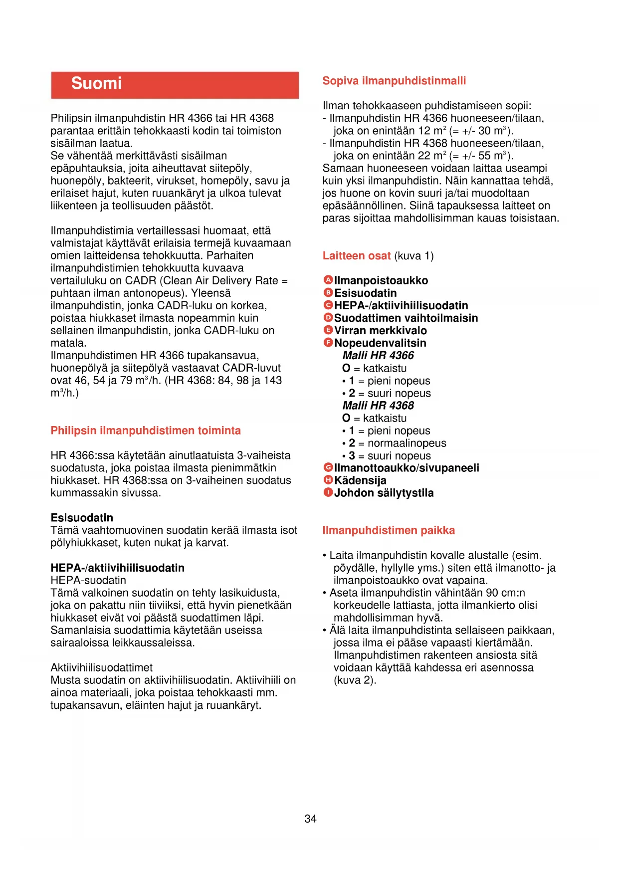 /h.) Philipsin ilmanpuhdistimen toiminta HR 4366:ssa käytetään ainutlaatuista 3-vaiheista suodatusta, joka poistaa ilmasta pienimmätkin hiukkaset. HR 4368:ssa on 3-vaiheinen suodatus kummassakin sivussa. Esisuodatin Tämä vaahtomuovinen suodatin kerää ilmasta isot pölyhiukkaset, kuten nukat ja karvat. HEPA-/aktiivihiilisuodatin HEPA-suodatin Tämä valkoinen suodatin on tehty lasikuidusta, joka on pakattu niin tiiviiksi, että hyvin pienetkään hiukkaset eivät voi päästä suodattimen läpi. Samanlaisia suodattimia käytetään useissa sairaaloissa leikkaussaleissa. Aktiivihiilisuodattimet Musta suodatin on aktiivihiilisuodatin. Aktiivihiili on ainoa materiaali, joka poistaa tehokkaasti mm. tupakansavun, eläinten hajut ja ruuankäryt.