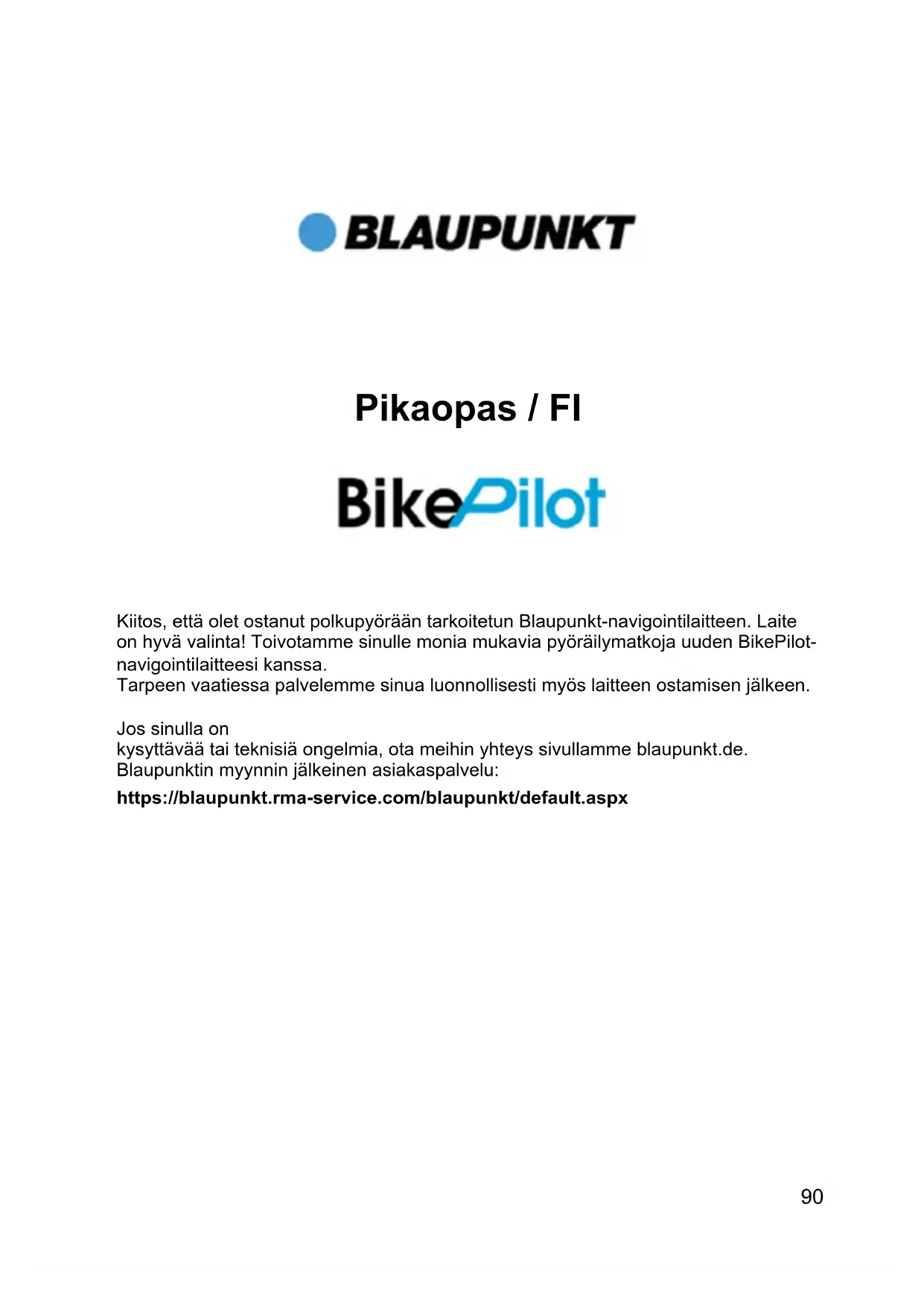 Kiitos, että olet ostanut polkupyörään tarkoitetun Blaupunkt-navigointilaitteen. Laite on hyvä valinta! Toivotamme sinulle monia mukavia pyöräilymatkoja uuden BikePilot-navigointilaitteesi kanssa. Tarpeen vaatiessa palvelemme sinua luonnollisesti myös laitteen ostamisen jälkeen. Jos sinulla on kysyttävää tai teknisiä ongelmia, ota meihin yhteys sivullamme blaupunkt.de. Blaupunktin myynnin jälkeinen asiakaspalvelu: https://blaupunkt.rma-service.com/blaupunkt/default.aspx91 HUOMAA! Tuotetta voidaan muuttaa ilman ennakkoilmoitusta. Pahoittelemme siitä mahdollisesti aiheutuvaa harmia. Varmista GPS-navigointilaitteen tiedot. Blaupunkt ei vastaa kartta- ja muiden tietojen katoamisesta. Vaikka käsikirjan sisältö on tarkastettu huolellisesti, se saattaa sisältää virheitä. Jos löydät siitä virheitä, ota yhteyttä asiakaspalveluumme: First Service Center. Lue tämän käsikirjan ohjeet huolellisesti ja käytä ainoastaan Blaupunkt- lisävarusteita, jotta mahdolliset vahingot vältetään. Näiden ohjeiden noudattamatta jättäminen johtaa kaikkien takuuehtojen raukeamiseen ja henkilökohtaisen turvallisuuden vaarantumiseen. Baros GmbH, Blaupunkt Mobility Division ei vastaa tällaisista tapauksista. Liikennejärjestelyihin tehtyjen muutosten vuoksi elektronisten navigointikarttojen tiedot eivät välttämättä vastaa tosiasiallisia liikennemerkkejä ja tienviittoja. Noudata liikennesääntöjä ja -merkkejä, ja huomioi ajaessasi kyseiset tieolosuhteet. GPS-navigointilaitteen käyttäminen ajon aikana voi aiheuttaa vakavia onnettomuuksia. Baros GmbH, Blaupunkt Mobility Division ei vastaa asiattomasta käyttötavasta aiheutuvista onnettomuuksista ja menetyksistä. Tietoja ohjelmistopäivityksistä on Internet-sivuillamme osoitteessa: www.blaupunkt.de Käsikirjan kuvat vastaavat kulloinkin kuvattua tilannetta, ja ne voivat vaihdella hieman mallista riippuen. Käytä laitetta VAIN tylpällä kynällä tai sormenpäällä. Näytön pinta naarmuuntuu herkästi. Älä käytä laitetta terävillä esineillä tai kynsillä. Oman turvallisuutesi takaamiseksi älä käytä laitetta ajon aikana! Käytä tätä tuotetta määräystenmukaisesti. Se on tarkoitettu ainoastaan apuvälineeksi ajon aikana. Sitä ei ole tarkoitettu tarkkaan matkan- tai suunnanmittaukseen eikä kartoitukseen. Laskettu reitti on tarkoitettu ainoastaan navigoinnin tueksi. Pyöräilijän tehtävänä on huomioida ajon aikana liikennemerkit, läpiajokiellot ja paikalliset tieolosuhteiden erikoispiirteet. BikePilot-laitteessa käytetään Open Street Map (OSM) -karttoja. Nämä yhteisön laatimat ja jatkuvasti täydentämät kartat voivat maasta ja alueesta riippuen olla paikoittain puutteellisia. Pahoittelemme tätä. Tästä huolimatta OSM:n kartat ovat tällä hetkellä parhaat tuntemamme pyöräilyyn sopivat kartat. Erityisesti liikuttaessa sivussa pinnoitetuilta teiltä ne tarjoavat lyömättömiä etuja, joita sinäkin tulet varmasti arvostamaan pyöräillessäsi.92