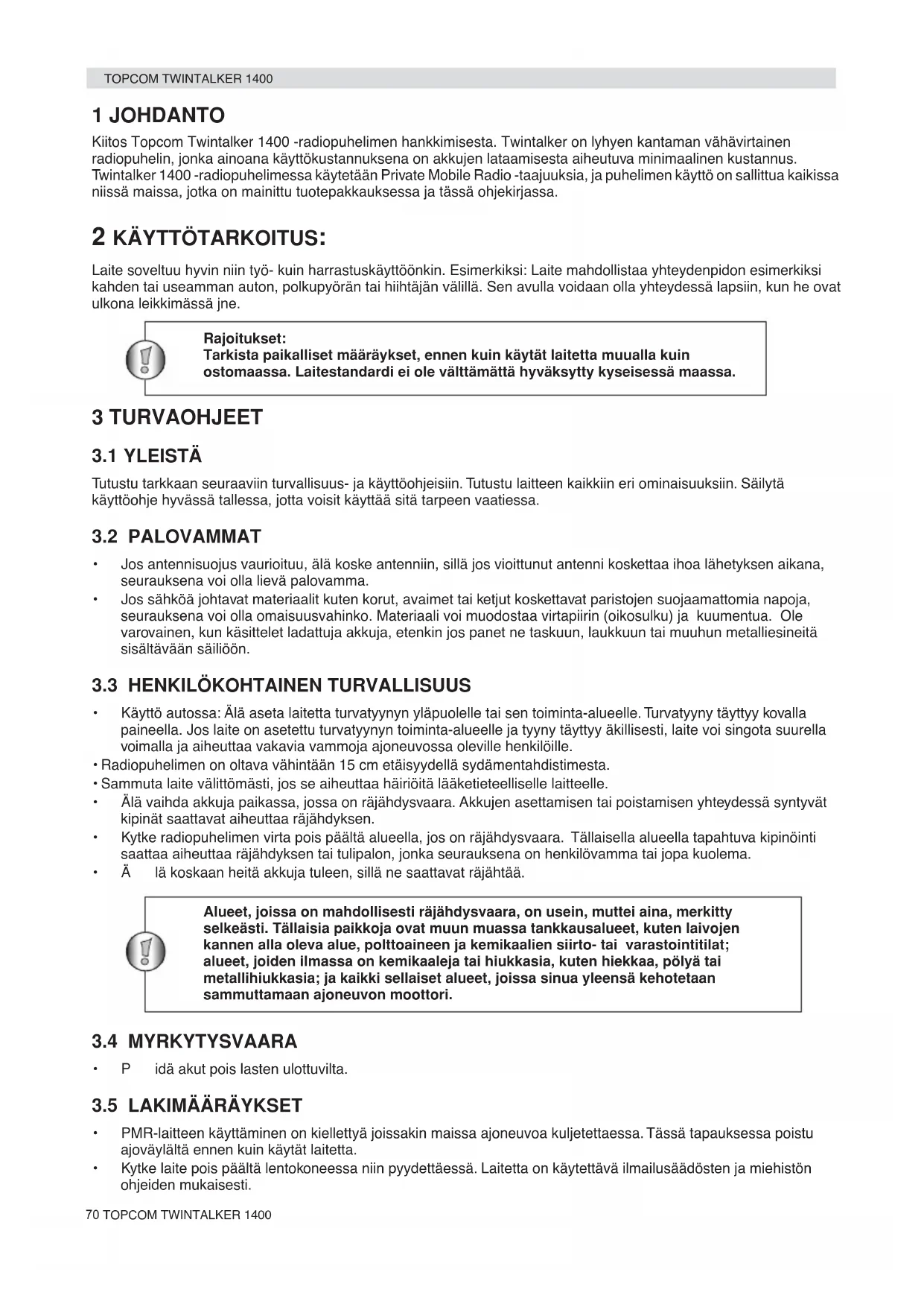 - Kytke laite pois päältä lentokoneessa niin pyydettäessä. Laitetta on käytettävä ilmailusäädösten ja miehistön ohjeiden mukaisesti. Rajoitukset: Tarkista paikalliset määräykset, ennen kuin käytät laitetta muualla kuin ostomaassa. Laitestandardi ei ole välttämättä hyväksytty kyseisessä maassa. Alueet, joissa on mahdollisesti räjähdysvaara, on usein, muttei aina, merkitty selkeästi. Tällaisia paikkoja ovat muun muassa tankkausalueet, kuten laivojen kannen alla oleva alue, polttoaineen ja kemikaalien siirto- tai varastointitilat; alueet, joiden ilmassa on kemikaaleja tai hiukkasia, kuten hiekkaa, pölyä tai metallihiukkasia; ja kaikki sellaiset alueet, joissa sinua yleensä kehotetaan sammuttamaan ajoneuvon moottori.TOPCOM TWINTALKER 1400 71TOPCOM TWINTALKER 1400 SUOMI