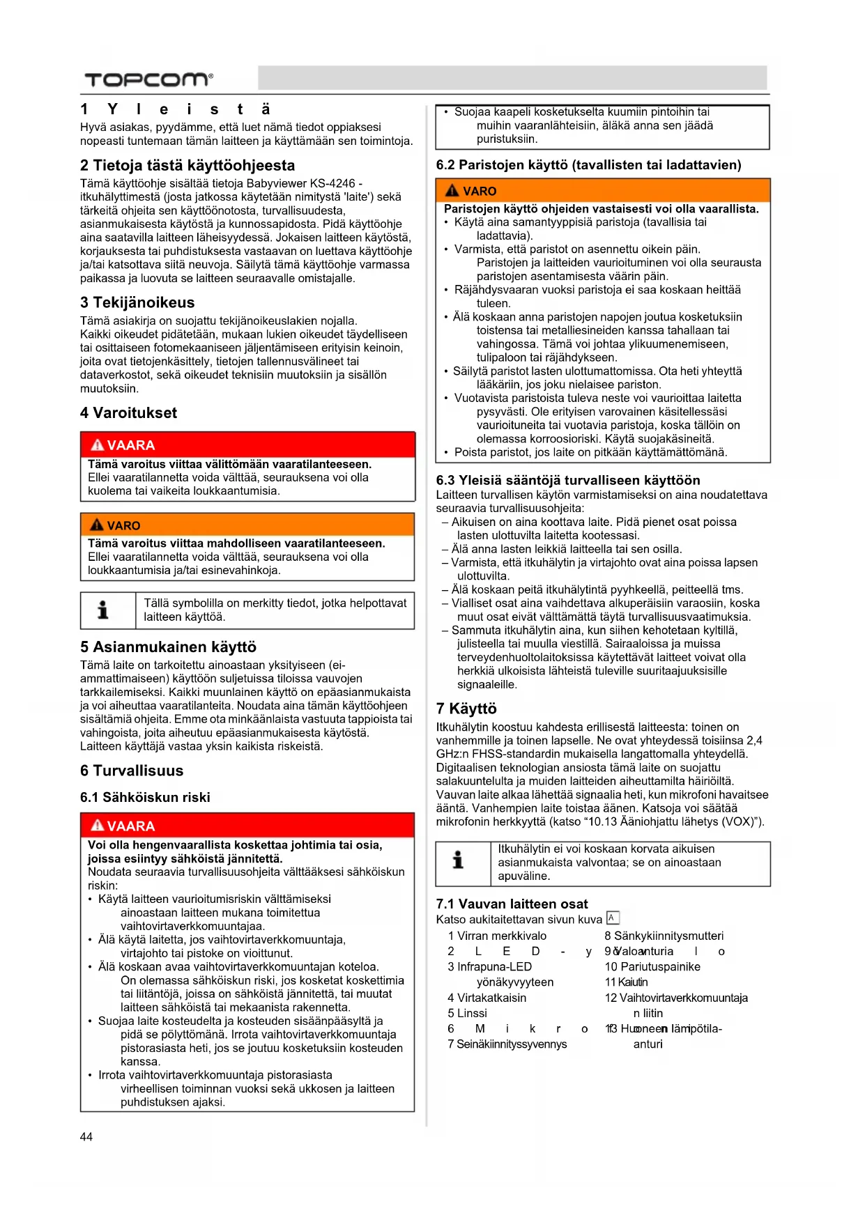 1Yleistä Hyvä asiakas, pyydämme, että luet nämä tiedot oppiaksesi nopeasti tuntemaan tämän laitteen ja käyttämään sen toimintoja. 2 Tietoja tästä käyttöohjeesta Tämä käyttöohje sisältää tietoja Babyviewer KS-4246 -itkuhälyttimestä (josta jatkossa käytetään nimitystä 'laite') sekä tärkeitä ohjeita sen käyttöönotosta, turvallisuudesta, asianmukaisesta käytöstä ja kunnossapidosta. Pidä käyttöohje aina saatavilla laitteen läheisyydessä. Jokaisen laitteen käytöstä, korjauksesta tai puhdistuksesta vastaavan on luettava käyttöohje ja/tai katsottava siitä neuvoja. Säilytä tämä käyttöohje varmassa paikassa ja luovuta se laitteen seuraavalle omistajalle. 3 Tekijänoikeus Tämä asiakirja on suojattu tekijänoikeuslakien nojalla.Kaikki oikeudet pidätetään, mukaan lukien oikeudet täydelliseen tai osittaiseen fotomekaaniseen jäljentämiseen erityisin keinoin, joita ovat tietojenkäsittely, tietojen tallennusvälineet tai dataverkostot, sekä oikeudet teknisiin muutoksiin ja sisällön muutoksiin. 4 Varoitukset 5 Asianmukainen käyttö Tämä laite on tarkoitettu ainoastaan yksityiseen (ei-ammattimaiseen) käyttöön suljetuissa tiloissa vauvojen tarkkailemiseksi. Kaikki muunlainen käyttö on epäasianmukaista ja voi aiheuttaa vaaratilanteita. Noudata aina tämän käyttöohjeen sisältämiä ohjeita. Emme ota minkäänlaista vastuuta tappioista tai vahingoista, joita aiheutuu epäasianmukaisesta käytöstä.Laitteen käyttäjä vastaa yksin kaikista riskeistä. 6 Turvallisuus