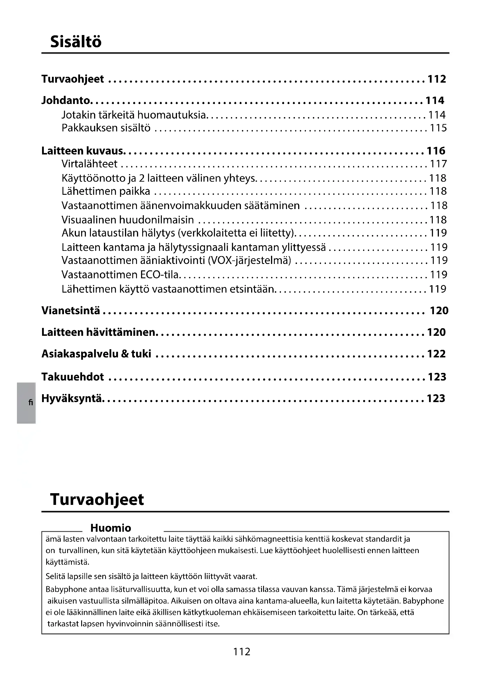 - Med de nævnte regler er der ikke tale om en omvendt bevisbyrde til skade for kunden. For at påberåbe dig denne garanti bedes du henvende dig til Gigaset Communications. Godkendelser Dette apparat er beregnet til brug jorden over, uden for det europæiske handelsom- råde (med undtagelse af Schweiz), afhængigt af nationale godkendelser. Der er taget hensyn til særlige forhold i det enkelte land. Gigaset Communications GmbH erklærer hermed, at denne enhed opfylder de grundlæggende krav og andre relevante bestemmelser i direktiv 1999/5/EF. En kopi af overensstemmelseserklæringen er tilgængelig på denne internetadresse: www.gigaset.com/docs dk112 Sisältö Turvaohjeet ............................................................112 Johdanto...............................................................114 Jotakin tärkeitä huomautuksia..............................................114 Pakkauksen sisältö .........................................................115 Laitteen kuvaus.........................................................116 Virtalähteet ................................................................117 Käyttöönotto ja 2 laitteen välinen yhteys....................................118 Lähettimen paikka .........................................................118 Vastaanottimen äänenvoimakkuuden säätäminen ..........................118 Visuaalinen huudonilmaisin ................................................118 Akun lataustilan hälytys (verkkolaitetta ei liitetty)............................119 Laitteen kantama ja hälytyssignaali kantaman ylittyessä .....................119 Vastaanottimen ääniaktivointi (VOX-järjestelmä) ............................119 Vastaanottimen ECO-tila....................................................119 Lähettimen käyttö vastaanottimen etsintään................................119 Vianetsintä ............................................................. 120 Laitteen hävittäminen...................................................120 Asiakaspalvelu & tuki ...................................................122 Takuuehdot ............................................................123 Hyväksyntä.............................................................123 Turvaohjeet ämä lasten valvontaan tarkoitettu laite täyttää kaikki sähkömagneettisia kenttiä koskevat standardit ja on turvallinen, kun sitä käytetään käyttöohjeen mukaisesti. Lue käyttöohjeet huolellisesti ennen laitteen käyttämistä. Selitä lapsille sen sisältö ja laitteen käyttöön liittyvät vaarat. Babyphone antaa lisäturvallisuutta, kun et voi olla samassa tilassa vauvan kanssa. Tämä järjestelmä ei korvaa aikuisen vastuullista silmälläpitoa. Aikuisen on oltava aina kantama-alueella, kun laitetta käytetään. Babyphone ei ole lääkinnällinen laite eikä äkillisen kätkytkuoleman ehkäisemiseen tarkoitettu laite. On tärkeää, että tarkastat lapsen hyvinvoinnin säännöllisesti itse. Huomio