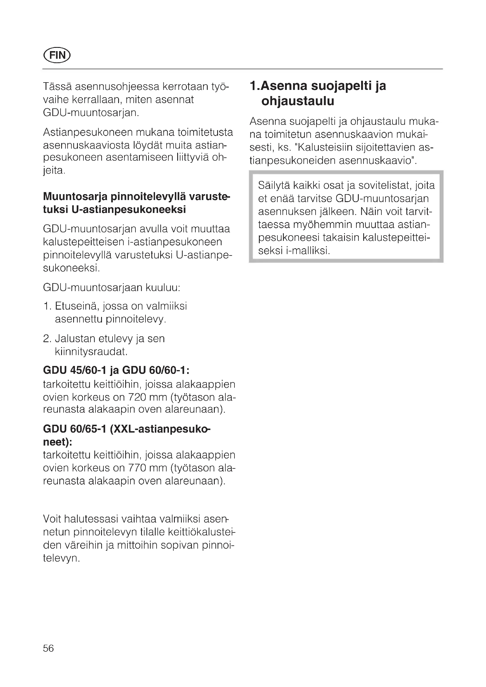 kiinnitysraudat. GDU 45/60-1 ja GDU 60/60-1: tarkoitettu keittiöihin, joissa alakaappien ovien korkeus on 720 mm (työtason ala- reunasta alakaapin oven alareunaan). GDU 60/65-1 (XXL-astianpesuko