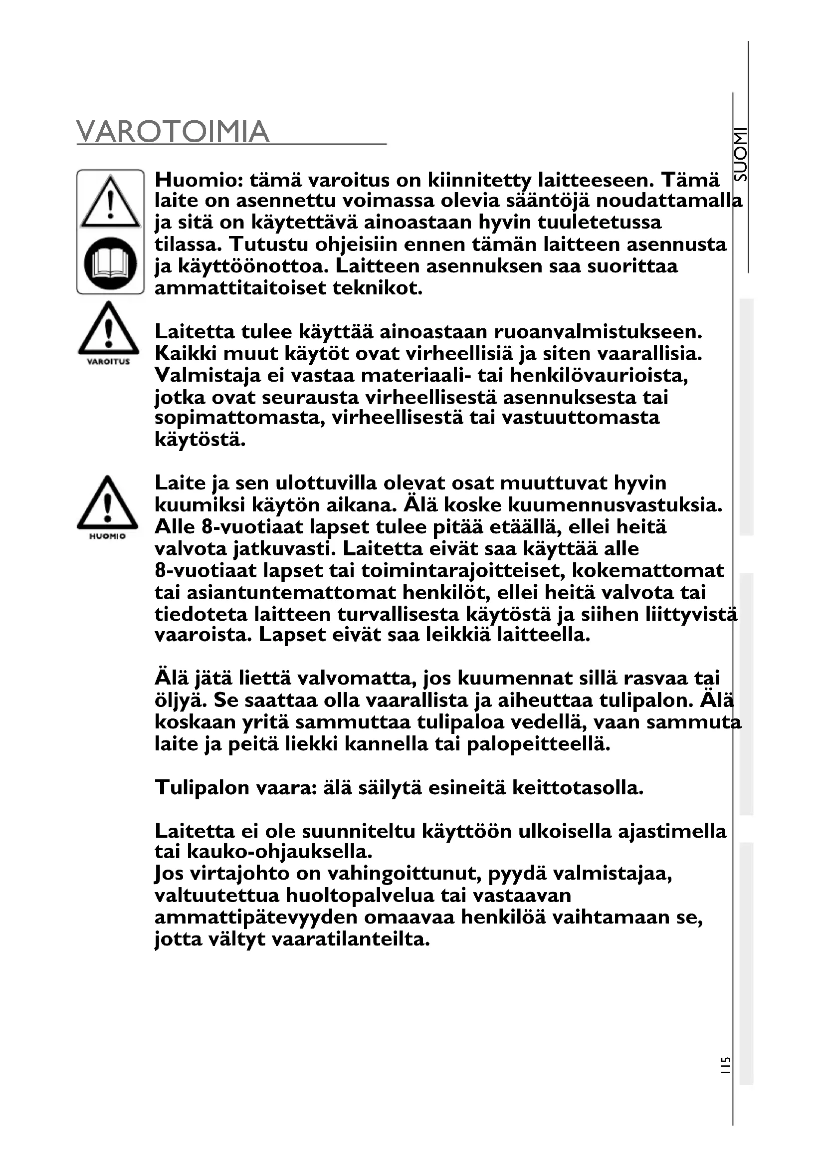 SUOMI VAROTOIMIA Huomio: tämä varoitus on kiinnitetty laitteeseen. Tämä laite on asennettu voimassa olevia sääntöjä noudattamalla ja sitä on käytettävä ainoastaan hyvin tuuletetussa tilassa. Tutustu ohjeisiin ennen tämän laitteen asennusta ja käyttöönottoa. Laitteen asennuksen saa suorittaa ammattitaitoiset teknikot. Laitetta tulee käyttää ainoastaan ruoanvalmistukseen. Kaikki muut käytöt ovat virheellisiä ja siten vaarallisia. Valmistaja ei vastaa materiaali- tai henkilövaurioista, jotka ovat seurausta virheellisestä asennuksesta tai sopimattomasta, virheellisestä tai vastuuttomasta käytöstä. Laite ja sen ulottuvilla olevat osat muuttuvat hyvin kuumiksi käytön aikana. Älä koske kuumennusvastuksia. Alle 8-vuotiaat lapset tulee pitää etäällä, ellei heitä valvota jatkuvasti. Laitetta eivät saa käyttää alle 8-vuotiaat lapset tai toimintarajoitteiset, kokemattomat tai asiantuntemattomat henkilöt, ellei heitä valvota tai tiedoteta laitteen turvallisesta käytöstä ja siihen liittyvistä vaaroista. Lapset eivät saa leikkiä laitteella. Älä jätä liettä valvomatta, jos kuumennat sillä rasvaa tai öljyä. Se saattaa olla vaarallista ja aiheuttaa tulipalon. Älä koskaan yritä sammuttaa tulipaloa vedellä, vaan sammuta laite ja peitä liekki kannella tai palopeitteellä. Tulipalon vaara: älä säilytä esineitä keittotasolla. Laitetta ei ole suunniteltu käyttöön ulkoisella ajastimella tai kauko-ohjauksella. Jos virtajohto on vahingoittunut, pyydä valmistajaa, valtuutettua huoltopalvelua tai vastaavan ammattipätevyyden omaavaa henkilöä vaihtamaan se, jotta vältyt vaaratilanteilta.HUOLTO KÄYTTÖASENNUS Lapset eivät saa puhdistaa tai huoltaa laitetta ilman valvontaa. Älä käytä hankaavia tai teräviä metallilastoja lasisten uuninluukkujen puhdistukseen sillä ne saattavat naarmuttaa pintaa ja rikkoa lasin. Älä pese laitetta höyrypesurilla. LISÄVAROTOIMIA