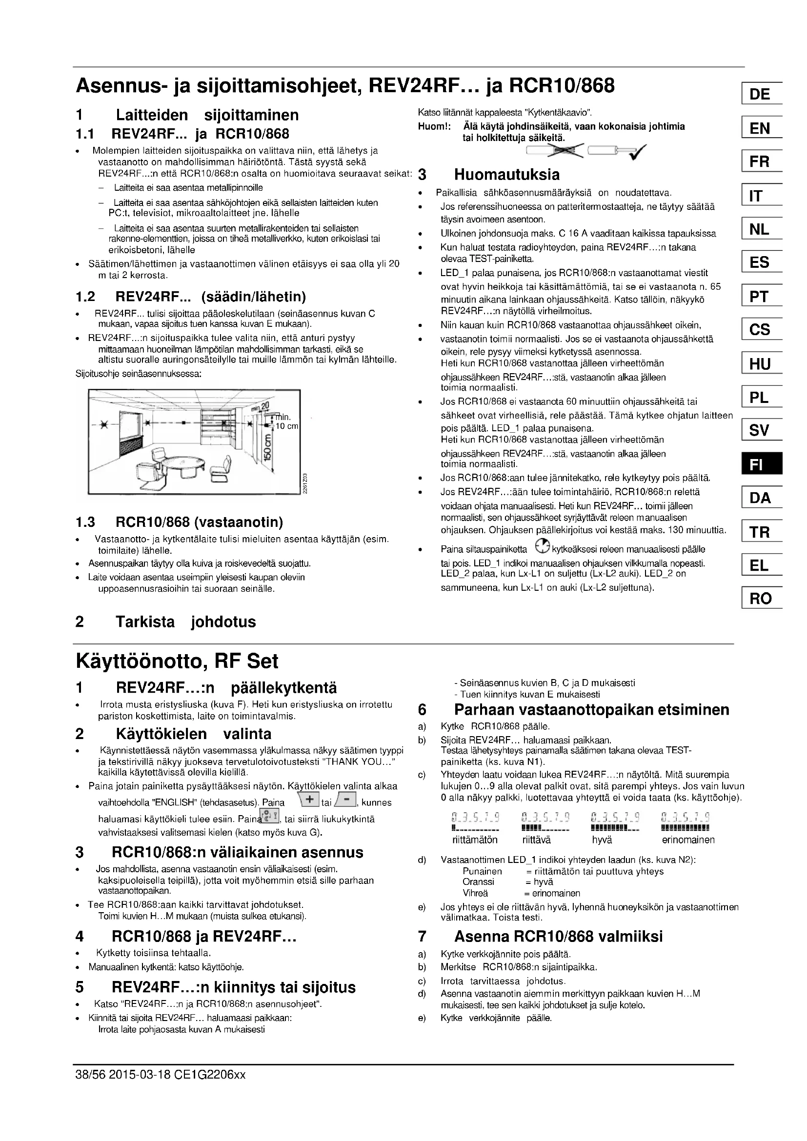 RO38/56 2015-03-18 CE1G2206xx Asennus- ja sijoittamisohjeet, REV24RF… ja RCR10/868 1 Laitteiden sijoittaminen