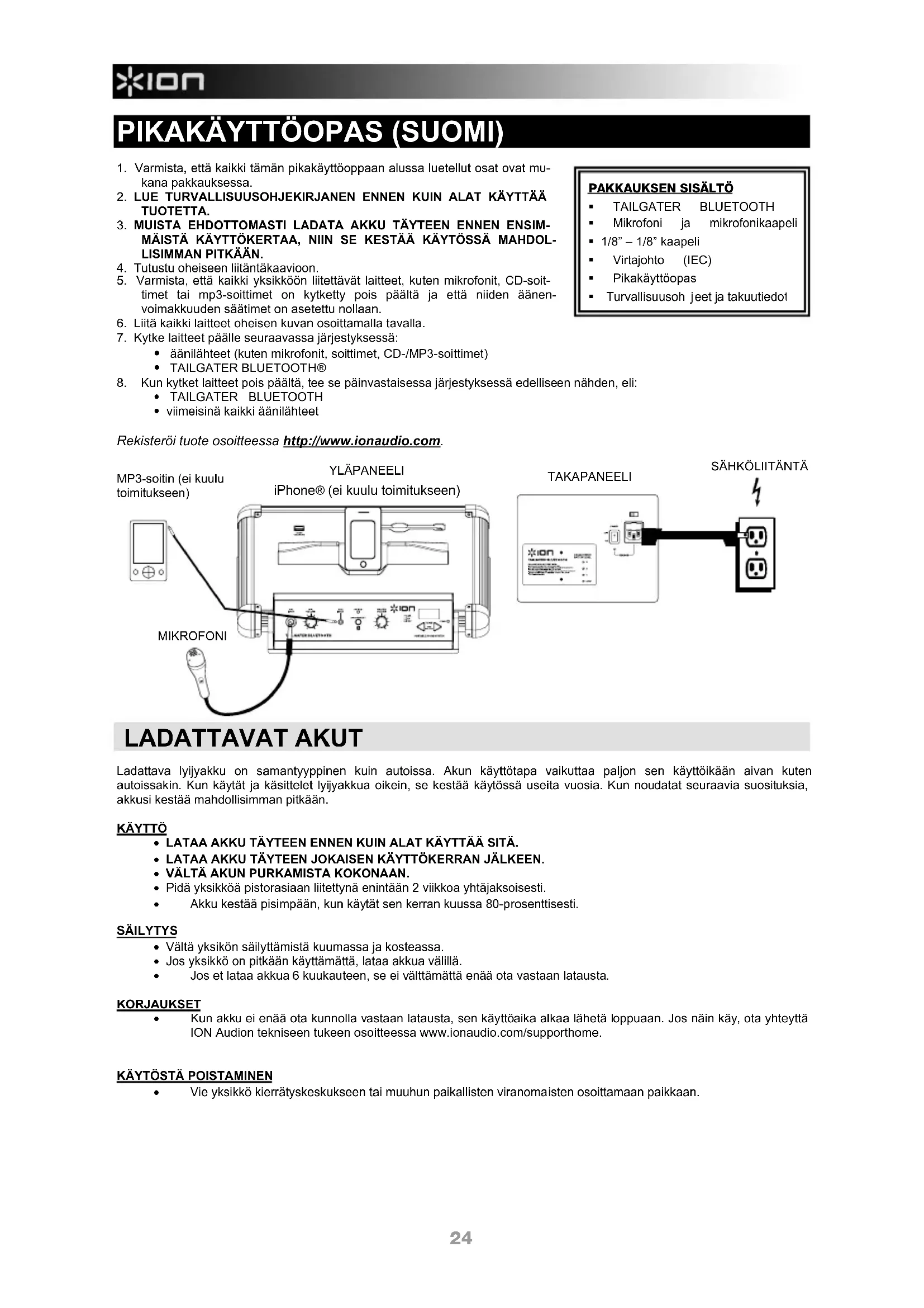 - TAILGATER BLUETOOTH • viimeisinä kaikki äänilähteet Rekisteröi tuote osoitteessa http://www.ionaudio.com.