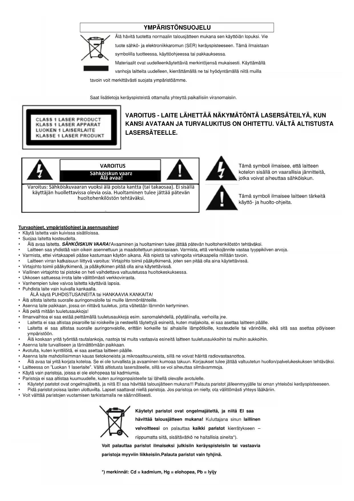 - Laitteessa on "Luokan 1 laserlaite". Vältä altistusta lasersäteelle, sillä se voi aiheuttaa silmävammoja.