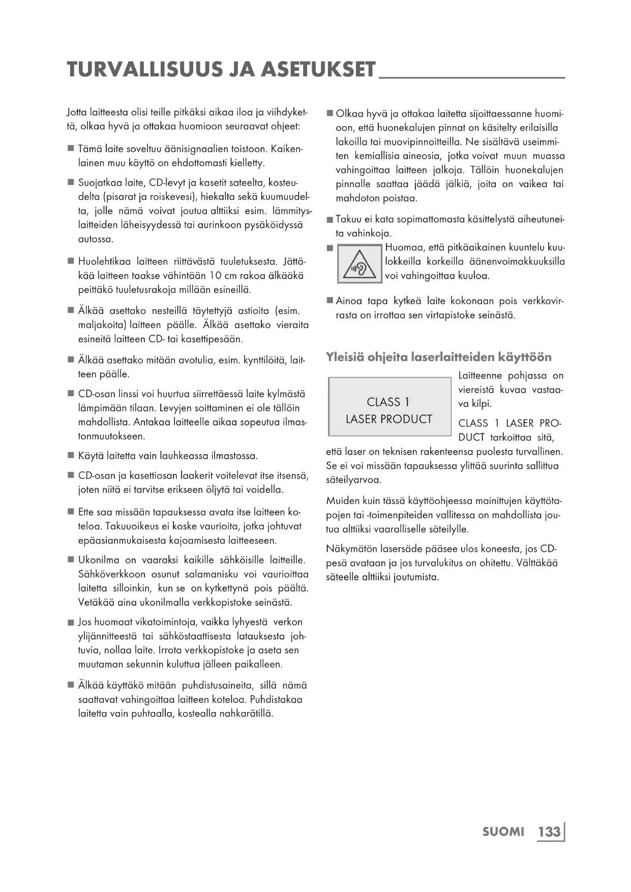 DUCT tarkoittaa sitä, että laser on teknisen rakenteensa puolesta turvallinen. Se ei voi missään tapauksessa ylittää suurinta sallittua säteilyarvoa. Muiden kuin tässä käyttöohjeessa mainittujen käyttöta- pojen tai -toimenpiteiden vallitessa on mahdollista jou- tua alttiiksi vaaralliselle säteilylle. Näkymätön lasersäde pääsee ulos koneesta, jos CD- pesä avataan ja jos turvalukitus on ohitettu. Välttäkää säteelle alttiiksi joutumista. Jotta laitteesta olisi teille pitkäksi aikaa iloa ja viihdyket- tä, olkaa hyvä ja ottakaa huomioon seuraavat ohjeet: