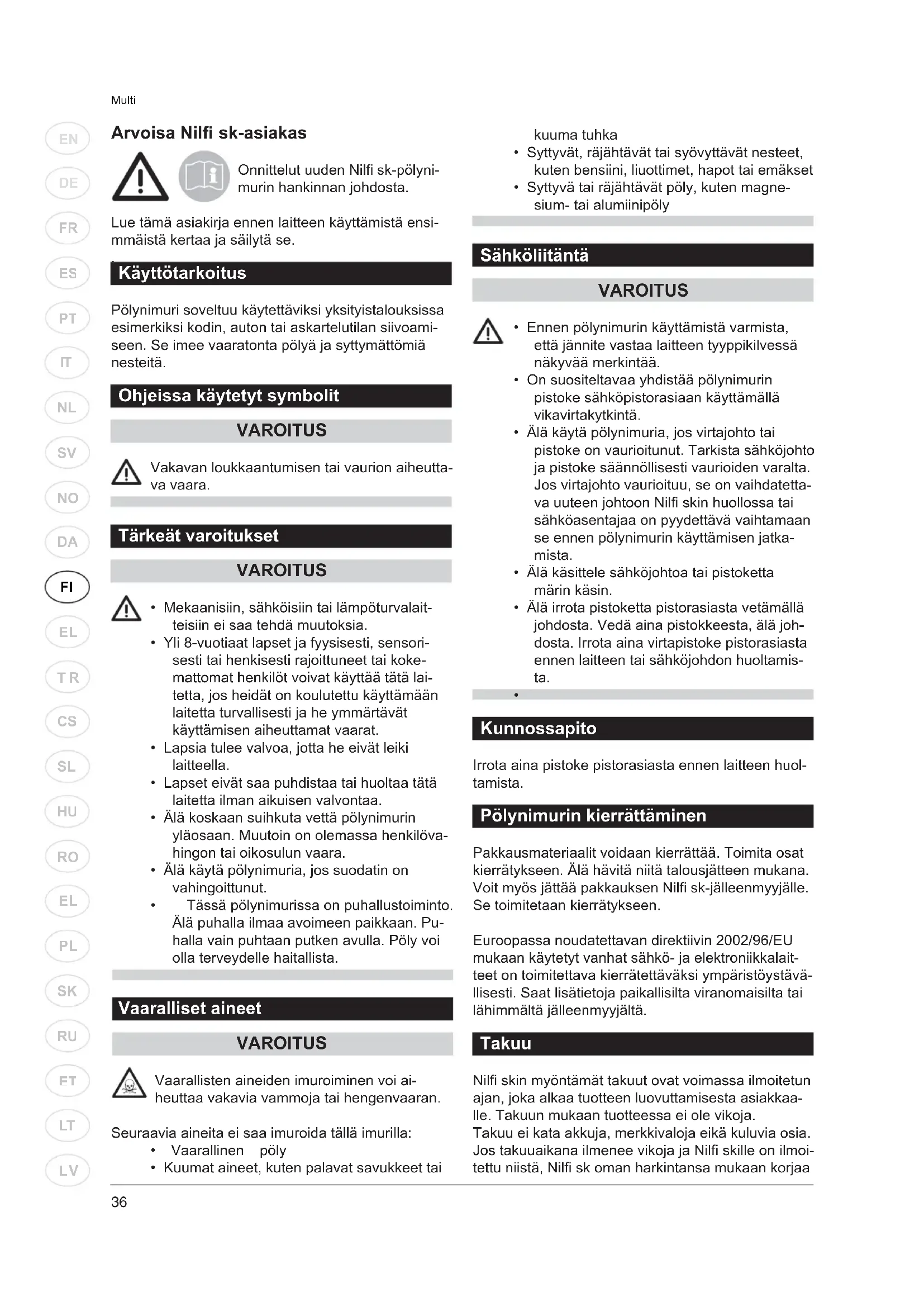 Kunnossapito Irrota aina pistoke pistorasiasta ennen laitteen huol- tamista. Pölynimurin kierrättäminen Pakkausmateriaalit voidaan kierrättää. Toimita osat kierrätykseen. Älä hävitä niitä talousjätteen mukana. Voit myös jättää pakkauksen Nilfi sk-jälleenmyyjälle. Se toimitetaan kierrätykseen. Euroopassa noudatettavan direktiivin 2002/96/EU mukaan käytetyt vanhat sähkö- ja elektroniikkalait- teet on toimitettava kierrätettäväksi ympäristöystävä- llisesti. Saat lisätietoja paikallisilta viranomaisilta tai lähimmältä jälleenmyyjältä. Takuu Nilfi skin myöntämät takuut ovat voimassa ilmoitetun ajan, joka alkaa tuotteen luovuttamisesta asiakkaa- lle. Takuun mukaan tuotteessa ei ole vikoja. Takuu ei kata akkuja, merkkivaloja eikä kuluvia osia. Jos takuuaikana ilmenee vikoja ja Nilfi skille on ilmoi- tettu niistä, Nilfi sk oman harkintansa mukaan korjaa37 Multi