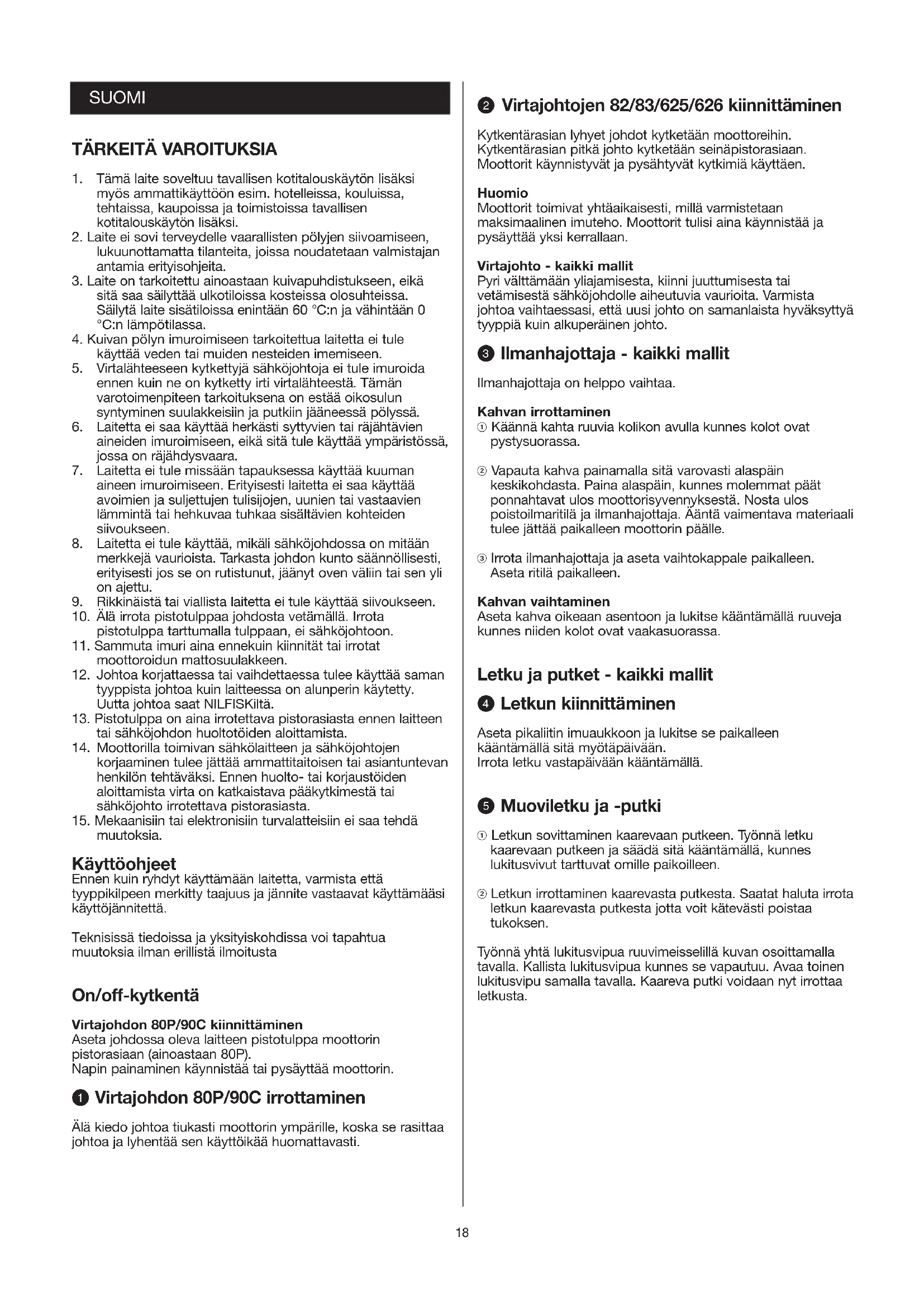muutoksia. Käyttöohjeet Ennen kuin ryhdyt käyttämään laitetta, varmista että tyyppikilpeen merkitty taajuus ja jännite vastaavat käyttämääsi käyttöjännitettä. Teknisissä tiedoissa ja yksityiskohdissa voi tapahtua muutoksia ilman erillistä ilmoitusta On/off-kytkentä Virtajohdon 80P/90C kiinnittäminen Aseta johdossa oleva laitteen pistotulppa moottorin pistorasiaan (ainoastaan 80P). Napin painaminen käynnistää tai pysäyttää moottorin. Q Virtajohdon 80P/90C irrottaminen Älä kiedo johtoa tiukasti moottorin ympärille, koska se rasittaa johtoa ja lyhentää sen käyttöikää huomattavasti. W Virtajohtojen 82/83/625/626 kiinnittäminen Kytkentärasian lyhyet johdot kytketään moottoreihin. Kytkentärasian pitkä johto kytketään seinäpistorasiaan. Moottorit käynnistyvät ja pysähtyvät kytkimiä käyttäen. Huomio Moottorit toimivat yhtäaikaisesti, millä varmistetaan maksimaalinen imuteho. Moottorit tulisi aina käynnistää ja pysäyttää yksi kerrallaan. Virtajohto - kaikki mallit Pyri välttämään yliajamisesta, kiinni juuttumisesta tai vetämisestä sähköjohdolle aiheutuvia vaurioita. Varmista johtoa vaihtaessasi, että uusi johto on samanlaista hyväksyttyä tyyppiä kuin alkuperäinen johto. E Ilmanhajottaja - kaikki mallit Ilmanhajottaja on helppo vaihtaa. Kahvan irrottaminen ! Käännä kahta ruuvia kolikon avulla kunnes kolot ovat pystysuorassa. @ Vapauta kahva painamalla sitä varovasti alaspäin keskikohdasta. Paina alaspäin, kunnes molemmat päät ponnahtavat ulos moottorisyvennyksestä. Nosta ulos poistoilmaritilä ja ilmanhajottaja. Ääntä vaimentava materiaali tulee jättää paikalleen moottorin päälle. # Irrota ilmanhajottaja ja aseta vaihtokappale paikalleen. Aseta ritilä paikalleen. Kahvan vaihtaminen Aseta kahva oikeaan asentoon ja lukitse kääntämällä ruuveja kunnes niiden kolot ovat vaakasuorassa. Letku ja putket - kaikki mallit R Letkun kiinnittäminen Aseta pikaliitin imuaukkoon ja lukitse se paikalleen kääntämällä sitä myötäpäivään. Irrota letku vastapäivään kääntämällä. T Muoviletku ja -putki ! Letkun sovittaminen kaarevaan putkeen. Työnnä letku kaarevaan putkeen ja säädä sitä kääntämällä, kunnes lukitusvivut tarttuvat omille paikoilleen. @ Letkun irrottaminen kaarevasta putkesta. Saatat haluta irrota letkun kaarevasta putkesta jotta voit kätevästi poistaa tukoksen. Työnnä yhtä lukitusvipua ruuvimeisselillä kuvan osoittamalla tavalla. Kallista lukitusvipua kunnes se vapautuu. Avaa toinen lukitusvipu samalla tavalla. Kaareva putki voidaan nyt irrottaa letkusta.19 Y Imutehon säätely kaarevassa muoviputkessa ! Suulakkeen imutehoa voidaan säädellä kaarevassa putkessa olevan liukuventtiilin avulla. Imuteho on voimakkaimmillaan, kun venttiili on työnnetty etuasentoon ja aukko on täysin kiinni. @ Imutehoa voidaan vähentää irrallisten päällisten, verhojen tms. imurointia varten työntämällä venttiiliä taaksepäin. U Kaarevalla teräsputkella varustettu kumi- tai muoviletku Jos letku tai kaareva putki on tukossa, kaareva putki voidaan irrottaa letkusta tukoksen poistamista varten. Purkaminen Tartu lähimpänä kaarevaa putkea olevaan renkaaseen ja siirrä se varren yli vetämällä ja kääntämällä samanaikaisesti. Kokoaminen Kuminen liitin helpottaa työtä ja pidentää letkun käyttöikää. (Jos liitin muuttuu ahtaaksi, se tulee irrottaa ja käsitellä sisäpuolelta runsaalla talkilla). ! Aseta kuminen liitin tasaiselle pinnalle ja paina yksi rengas reunan yli kunnes se on paikallaan kumisen tupen urassa. @ Työnnä kaareva putki liitoskohdan läpi ja vedä se niin pitkälle kuin se menee. # Tartu kaarevaan putkeen vasemmalla kädellä läheltä kumista tuppea ja työnnä letkun palloliitos niin syvälle kuin mahdollista. $ Käännä tai työnnä seuraava rengas oikeaan asentoon kumisen liittimen uraan. % Vedä nuolten osoittamaan suuntaan. Letku on nyt koottu valmiiksi. I Ø50mm putkien 82/83/625/626 kokoaminen ! Ennen putkien ja suulakkeen kokoamista lukitusrengas irrotetaan vastapäivään kiertämällä. @ Seuraavaksi putki ja suulake kootaan ja lukitusrengasta kierretään myötäpäivään kunnes se ottaa kiinni. Lisävarusteet NILFISK tarjoaa laajan valikoiman putkia ja suulakkeita tavalliseen siivoukseen, korkeiden tasojen siivoukseen ja erityiskohteisiin. Ks. lisävarusteista kertova lehtinen. O Suodattimen ravistaminen (ainoastaan 80P) Siivouslaitetta voidaan käyttää myös ilman pölypussia. Tällöin pöly kertyy säiliön alaosaan, joka tyhjennetään tarvittaessa. Jotta imuteho säilyisi tasaisena, suodatin on pidettävä mahdollisimman puhtaana ravistelemalla tai imuroimalla se säännöllisesti. Suodatinta ei saa pestä tai harjata. 80P:n moottorin irrottaminen ja vaihtaminen ! Pidä kiinni moottorin kahvasta ja avaa yläsalvat. Nosta moottori ulos. @ Vedä suodatin ulos tarttumalla sen siniseen pohjaan ja ravistele sitä varovasti sivusuunnassa. Letkun tulee pysyä kiinni säiliössä ravistelun aikana. Asentaessasi moottoria takaisin paikalleen varmista, että kytkin on suoraan säiliön imuaukon yläpuolella ja että pistoke on käännetty taaksepäin. 90C:n moottorin irrottaminen ja vaihtaminen ! Irrota moottori kääntämällä sen kahvaa vastapäivään. Nosta moottori ulos. Suodatin voidaan puhdistaa imuroimalla. @ Aseta moottori takaisin paikalleen siten, että on/off-kytkin on linjassa säiliön yläosaan painetun on/off-kytkimen kuvan kanssa. Käännä moottoria myötäpäivään kunnes kuulet selvän naksahduksen. Jos moottori ei lukitu paikalleen sitä kääntämällä, paina säiliön sisällä olevaa punaista lukitusvipua nuolen osoittamaan suuntaan. 80P/90C:n säiliön tyhjentäminen Kun suodatin on puhdistettu ja letku irrotettu, avaa kaksi vipua ja aukaise säiliö. Nosta pois yläosa ja tyhjennä säiliön alaosa. 82/83:n ravistaminen Jotta imuteho säilyisi tasaisena, suodatin on pidettävä mahdollisimman puhtaana ravistelemalla se