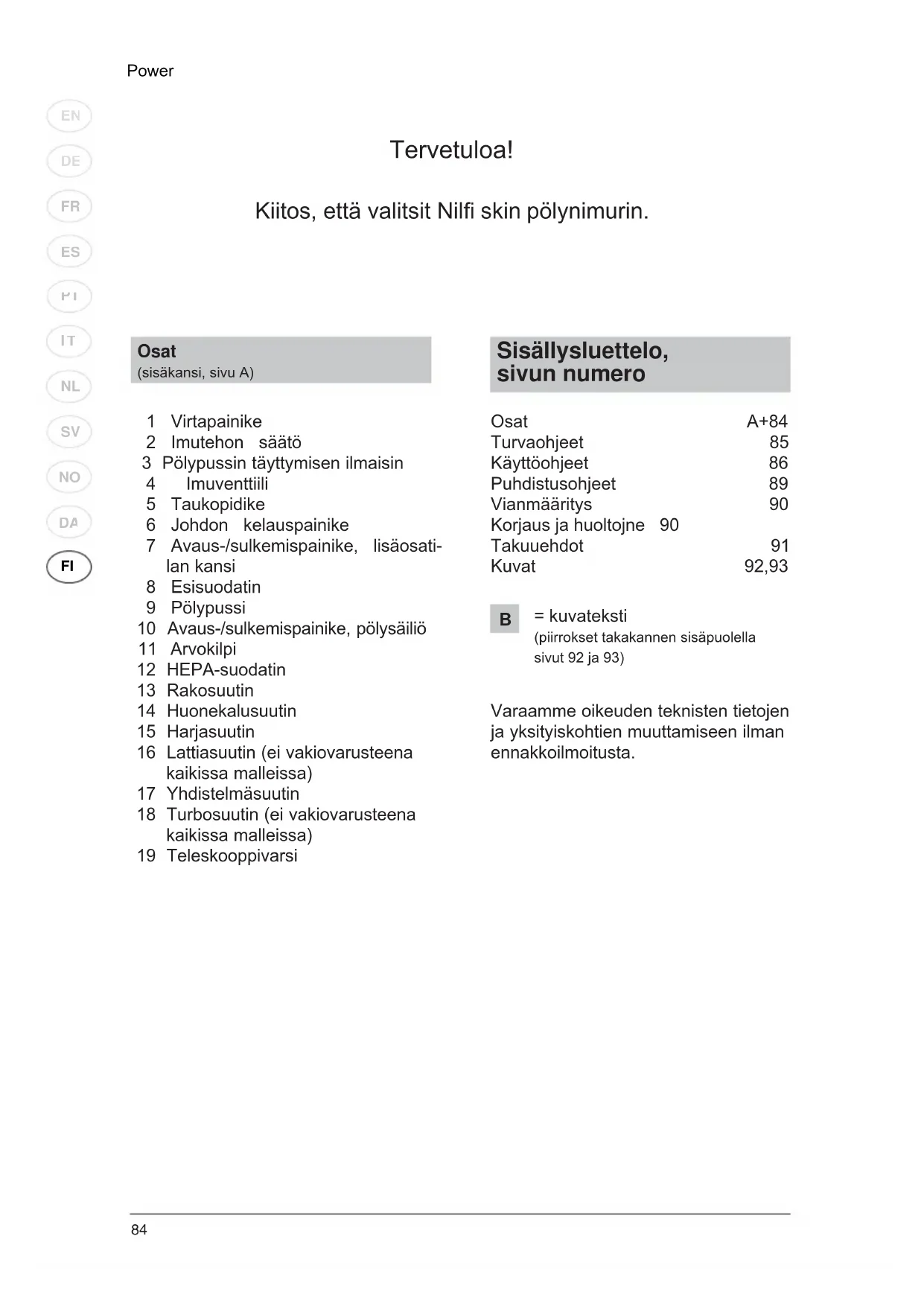 Sisällysluettelo, sivun numero Osat A+84 Turvaohjeet 85 Käyttöohjeet 86 Puhdistusohjeet 89 Vianmääritys 90 Korjaus ja huoltojne 90 Takuuehdot 91 Kuvat 92,93 Varaamme oikeuden teknisten tietojen ja yksityiskohtien muuttamiseen ilman ennakkoilmoitusta. Osat (sisäkansi, sivu A) 1 Virtapainike 2 Imutehon säätö 3 Pölypussin täyttymisen ilmaisin 4 Imuventtiili 5 Taukopidike 6 Johdon kelauspainike 7 Avaus-/sulkemispainike, lisäosati- lan kansi 8 Esisuodatin 9 Pölypussi 10 Avaus-/sulkemispainike, pölysäiliö 11 Arvokilpi 12 HEPA-suodatin 13 Rakosuutin 14 Huonekalusuutin 15 Harjasuutin 16 Lattiasuutin (ei vakiovarusteena kaikissa malleissa) 17 Yhdistelmäsuutin 18 Turbosuutin (ei vakiovarusteena kaikissa malleissa) 19 Teleskooppivarsi Tervetuloa! Kiitos, että valitsit Nilfi skin pölynimurin.