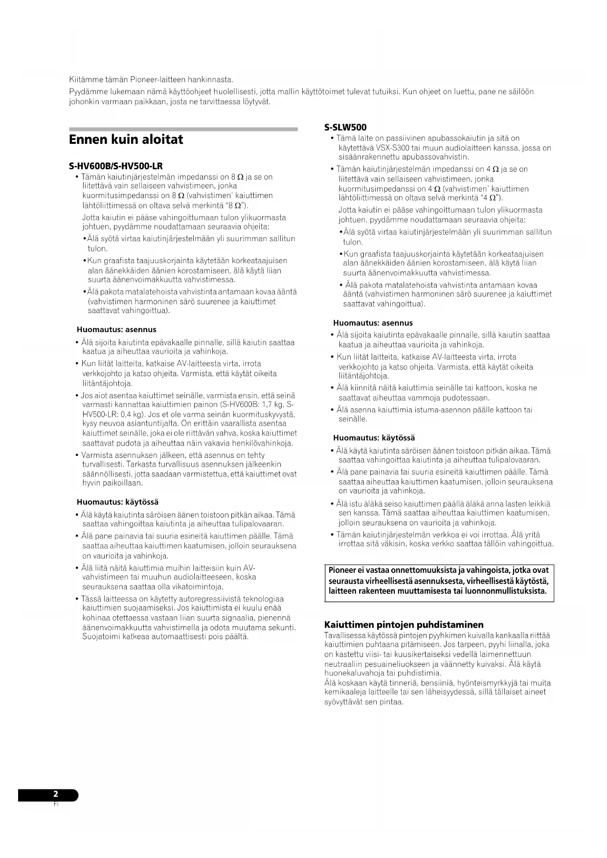 - Tämän kaiutinjärjestelmän verkkoa ei voi irrottaa. Älä yritä irrottaa sitä väkisin, koska verkko saattaa tällöin vahingoittua. Kaiuttimen pintojen puhdistaminen Tavallisessa käytössä pintojen pyyhkimen kuivalla kankaalla riittää kaiuttimien puhtaana pitämiseen. Jos tarpeen, pyyhi liinalla, joka on kastettu viisi- tai kuusikertaiseksi vedellä laimennettuun neutraaliin pesuaineliuokseen ja väännetty kuivaksi. Älä käytä huonekaluvahoja tai puhdistimia. Älä koskaan käytä tinneriä, bensiiniä, hyönteismyrkkyjä tai muita kemikaaleja laitteelle tai sen läheisyydessä, sillä tällaiset aineet syövyttävät sen pintaa. Pioneer ei vastaa onnettomuuksista ja vahingoista, jotka ovat seurausta virheellisestä asennuksesta, virheellisestä käytöstä, laitteen rakenteen muuttamisesta tai luonnonmullistuksista. S-HV600B_S-HV500-LR_En.fm 2 ページ 2011年4月12日 火曜日 午後6時59分3