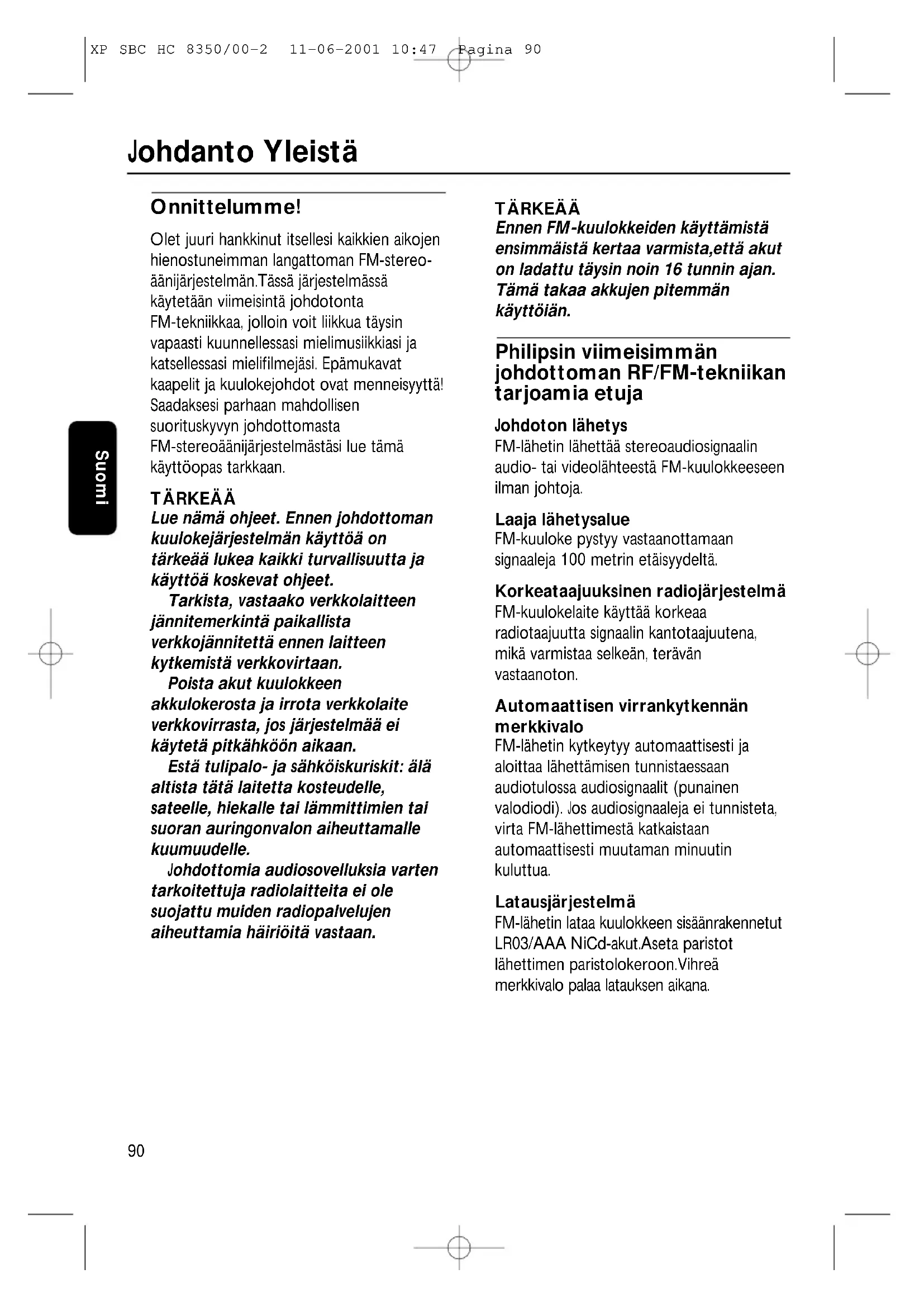 Onnittelumme! Olet juuri hankkinut itsellesi kaikkien aikojen hienostuneimman langattoman FM-stereo- äänijärjestelmän.Tässä järjestelmässä käytetään viimeisintä johdotonta FM-tekniikkaa, jolloin voit liikkua täysin vapaasti kuunnellessasi mielimusiikkiasi ja katsellessasi mielifilmejäsi. Epämukavat kaapelit ja kuulokejohdot ovat menneisyyttä! Saadaksesi parhaan mahdollisen suorituskyvyn johdottomasta FM-stereoäänijärjestelmästäsi lue tämä käyttöopas tarkkaan. TÄRKEÄÄ Lue nämä ohjeet. Ennen johdottoman kuulokejärjestelmän käyttöä on tärkeää lukea kaikki turvallisuutta ja käyttöä koskevat ohjeet. Tarkista, vastaako verkkolaitteen jännitemerkintä paikallista verkkojännitettä ennen laitteen kytkemistä verkkovirtaan. Poista akut kuulokkeen akkulokerosta ja irrota verkkolaite verkkovirrasta, jos järjestelmää ei käytetä pitkähköön aikaan. Estä tulipalo- ja sähköiskuriskit: älä altista tätä laitetta kosteudelle, sateelle, hiekalle tai lämmittimien tai suoran auringonvalon aiheuttamalle kuumuudelle. Johdottomia audiosovelluksia varten tarkoitettuja radiolaitteita ei ole suojattu muiden radiopalvelujen aiheuttamia häiriöitä vastaan. TÄRKEÄÄ Ennen FM-kuulokkeiden käyttämistä ensimmäistä kertaa varmista,että akut on ladattu täysin noin 16 tunnin ajan. Tämä takaa akkujen pitemmän käyttöiän. Philipsin viimeisimmän johdottoman RF/FM-tekniikan tarjoamia etuja Johdoton lähetys FM-lähetin lähettää stereoaudiosignaalin audio- tai videolähteestä FM-kuulokkeeseen ilman johtoja. Laaja lähetysalue FM-kuuloke pystyy vastaanottamaan signaaleja 100 metrin etäisyydeltä. Korkeataajuuksinen radiojärjestelmä FM-kuulokelaite käyttää korkeaa radiotaajuutta signaalin kantotaajuutena, mikä varmistaa selkeän, terävän vastaanoton. Automaattisen virrankytkennän merkkivalo FM-lähetin kytkeytyy automaattisesti ja aloittaa lähettämisen tunnistaessaan audiotulossa audiosignaalit (punainen valodiodi). Jos audiosignaaleja ei tunnisteta, virta FM-lähettimestä katkaistaan automaattisesti muutaman minuutin kuluttua. Latausjärjestelmä FM-lähetin lataa kuulokkeen sisäänrakennetut LR03/AAA NiCd-akut.Aseta paristot lähettimen paristolokeroon.Vihreä merkkivalo palaa latauksen aikana. Johdanto Yleistä XP SBC HC 8350/00-2 11-06-2001 10:47 Pagina 90Suomi
