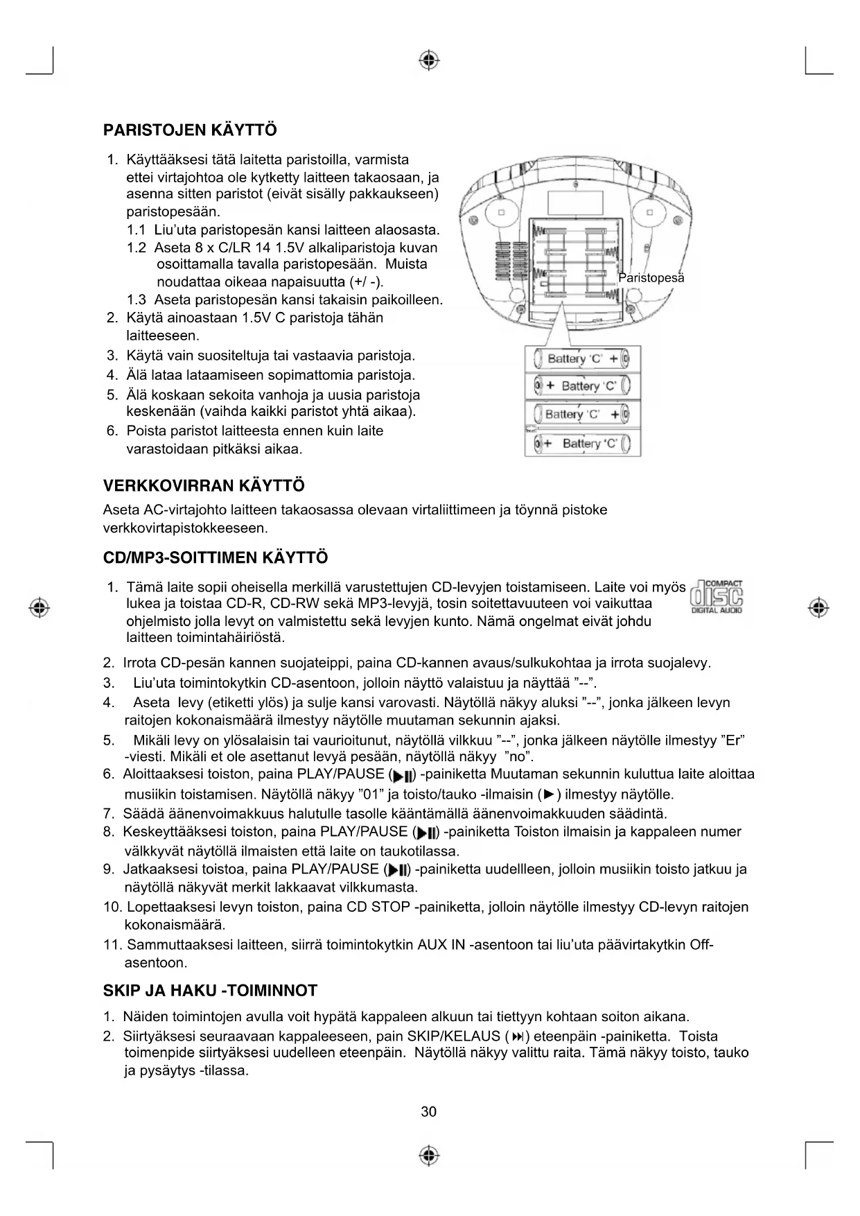 - Kayttaaksesi tata laitetta paristoilla, varmista etei virtajohtoa ole kytketty laitteen takaosaan, ja asenna sitten paristot (eivat sisally pakkaukseen) paristopesaan.