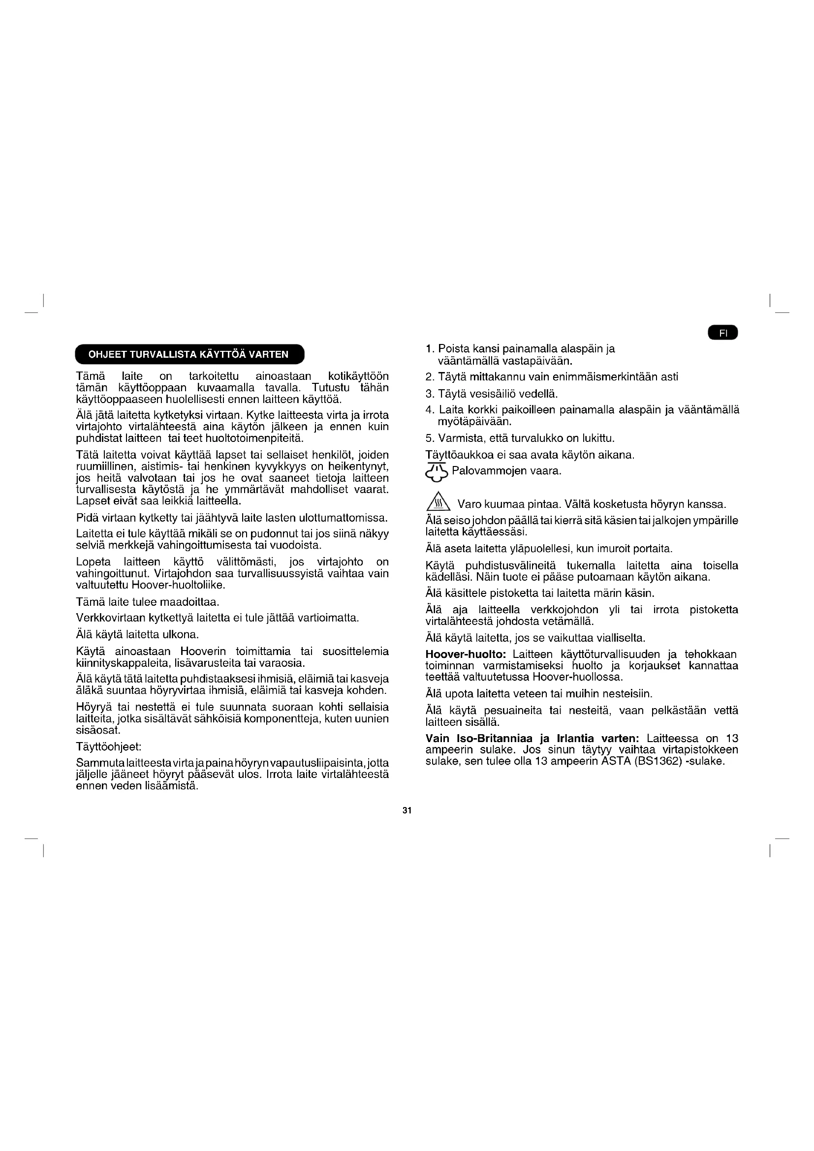 Tämä laite on tarkoitettu ainoastaan kotikäyttöön tämän käyttöoppaan kuvaamalla tavalla. Tutustu tähän käyttöoppaaseen huolellisesti ennen laitteen käyttöä. Älä jätä laitetta kytketyksi virtaan. Kytke laitteesta virta ja irrota virtajohto virtalähteestä aina käytön jälkeen ja ennen kuin puhdistat laitteen tai teet huoltotoimenpiteitä. Tätä laitetta voivat käyttää lapset tai sellaiset henkilöt, joiden ruumiillinen, aistimis- tai henkinen kyvykkyys on heikentynyt, jos heitä valvotaan tai jos he ovat saaneet tietoja laitteen turvallisesta käytöstä ja he ymmärtävät mahdolliset vaarat. Lapset eivät saa leikkiä laitteella. Pidä virtaan kytketty tai jäähtyvä laite lasten ulottumattomissa. Laitetta ei tule käyttää mikäli se on pudonnut tai jos siinä näkyy selviä merkkejä vahingoittumisesta tai vuodoista. Lopeta laitteen käyttö välittömästi, jos virtajohto on vahingoittunut. Virtajohdon saa turvallisuussyistä vaihtaa vain valtuutettu Hoover-huoltoliike. Tämä laite tulee maadoittaa. Verkkovirtaan kytkettyä laitetta ei tule jättää vartioimatta. Älä käytä laitetta ulkona. Käytä ainoastaan Hooverin toimittamia tai suosittelemia kiinnityskappaleita, lisävarusteita tai varaosia. Älä käytä tätä laitetta puhdistaaksesi ihmisiä, eläimiä tai kasveja äläkä suuntaa höyryvirtaa ihmisiä, eläimiä tai kasveja kohden. Höyryä tai nestettä ei tule suunnata suoraan kohti sellaisia laitteita, jotka sisältävät sähköisiä komponentteja, kuten uunien sisäosat. Täyttöohjeet: Sammuta laitteesta virta ja paina höyryn vapautusliipaisinta, jotta jäljelle jääneet höyryt pääsevät ulos. Irrota laite virtalähteestä ennen veden lisäämistä.