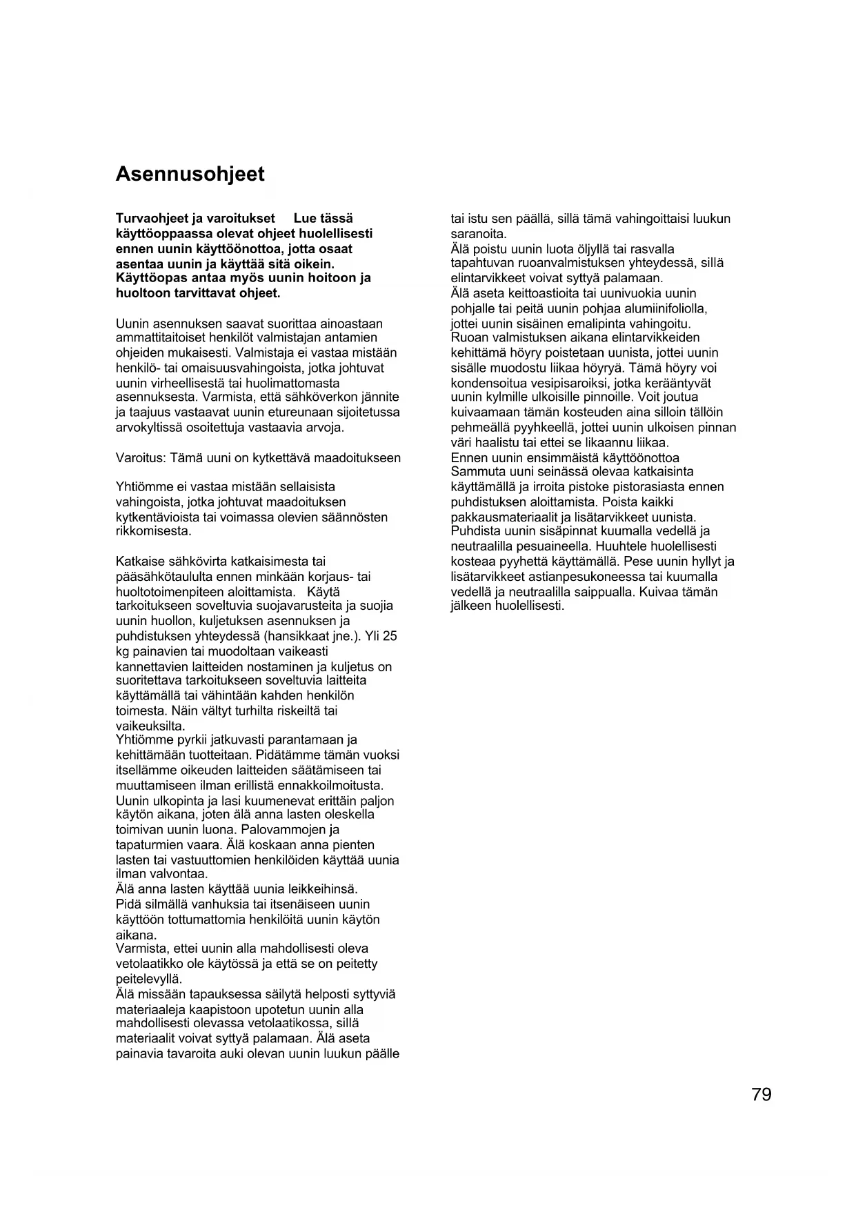 78Asennusohjeet Turvaohjeet ja varoitukset Lue tässä käyttöoppaassa olevat ohjeet huolellisesti ennen uunin käyttöönottoa, jotta osaat asentaa uunin ja käyttää sitä oikein. Käyttöopas antaa myös uunin hoitoon ja huoltoon tarvittavat ohjeet. Uunin asennuksen saavat suorittaa ainoastaan ammattitaitoiset henkilöt valmistajan antamien ohjeiden mukaisesti. Valmistaja ei vastaa mistään henkilö- tai omaisuusvahingoista, jotka johtuvat uunin virheellisestä tai huolimattomasta asennuksesta. Varmista, että sähköverkon jännite ja taajuus vastaavat uunin etureunaan sijoitetussa arvokyltissä osoitettuja vastaavia arvoja. Varoitus: Tämä uuni on kytkettävä maadoitukseen Yhtiömme ei vastaa mistään sellaisista vahingoista, jotka johtuvat maadoituksen kytkentävioista tai voimassa olevien säännösten rikkomisesta. Katkaise sähkövirta katkaisimesta tai pääsähkötaululta ennen minkään korjaus- tai huoltotoimenpiteen aloittamista. Käytä tarkoitukseen soveltuvia suojavarusteita ja suojia uunin huollon, kuljetuksen asennuksen ja puhdistuksen yhteydessä (hansikkaat jne.). Yli 25 kg painavien tai muodoltaan vaikeasti kannettavien laitteiden nostaminen ja kuljetus on suoritettava tarkoitukseen soveltuvia laitteita käyttämällä tai vähintään kahden henkilön toimesta. Näin vältyt turhilta riskeiltä tai vaikeuksilta. Yhtiömme pyrkii jatkuvasti parantamaan ja kehittämään tuotteitaan. Pidätämme tämän vuoksi itsellämme oikeuden laitteiden säätämiseen tai muuttamiseen ilman erillistä ennakkoilmoitusta. Uunin ulkopinta ja lasi kuumenevat erittäin paljon käytön aikana, joten älä anna lasten oleskella toimivan uunin luona. Palovammojen ja tapaturmien vaara. Älä koskaan anna pienten lasten tai vastuuttomien henkilöiden käyttää uunia ilman valvontaa. Älä anna lasten käyttää uunia leikkeihinsä. Pidä silmällä vanhuksia tai itsenäiseen uunin käyttöön tottumattomia henkilöitä uunin käytön aikana. Varmista, ettei uunin alla mahdollisesti oleva vetolaatikko ole käytössä ja että se on peitetty peitelevyllä. Älä missään tapauksessa säilytä helposti syttyviä materiaaleja kaapistoon upotetun uunin alla mahdollisesti olevassa vetolaatikossa, sillä materiaalit voivat syttyä palamaan. Älä aseta painavia tavaroita auki olevan uunin luukun päälle tai istu sen päällä, sillä tämä vahingoittaisi luukun saranoita. Älä poistu uunin luota öljyllä tai rasvalla tapahtuvan ruoanvalmistuksen yhteydessä, sillä elintarvikkeet voivat syttyä palamaan. Älä aseta keittoastioita tai uunivuokia uunin pohjalle tai peitä uunin pohjaa alumiinifoliolla, jottei uunin sisäinen emalipinta vahingoitu. Ruoan valmistuksen aikana elintarvikkeiden kehittämä höyry poistetaan uunista, jottei uunin sisälle muodostu liikaa höyryä. Tämä höyry voi kondensoitua vesipisaroiksi, jotka kerääntyvät uunin kylmille ulkoisille pinnoille. Voit joutua kuivaamaan tämän kosteuden aina silloin tällöin pehmeällä pyyhkeellä, jottei uunin ulkoisen pinnan väri haalistu tai ettei se likaannu liikaa. Ennen uunin ensimmäistä käyttöönottoa Sammuta uuni seinässä olevaa katkaisinta käyttämällä ja irroita pistoke pistorasiasta ennen puhdistuksen aloittamista. Poista kaikki pakkausmateriaalit ja lisätarvikkeet uunista. Puhdista uunin sisäpinnat kuumalla vedellä ja neutraalilla pesuaineella. Huuhtele huolellisesti kosteaa pyyhettä käyttämällä. Pese uunin hyllyt ja lisätarvikkeet astianpesukoneessa tai kuumalla vedellä ja neutraalilla saippualla. Kuivaa tämän jälkeen huolellisesti. 79Tekniset tiedot Tämä laite vastaa EU- direktiivien 72/23 ja 93/68 sekä EMC 89/336 vaatimuksia. Jännitettä koskevat ohjeet § 230 V vaihe + nolla. Kaapistoon upotetun uunin mitat: Pituus: 440 Syvyys: 390 Korkeus : 340 Tilavuus : 59 Litraa Lämmitysvastusten tehot Alempi lämmitysvastus: 1,3 kW Ylempi lämmitysvastus: 0,9 kW Grillivastus: 1,6 kW Tuulettimen elementti: 2,3 kW Uunin maks. virrankulutus: 3,1 kW Uunin asennus kaapistoon TÄRKEÄÄ: Asenna uuni oikein valmistajan antamien ohjeiden mukaisesti. Asennuksen saavat suorittaa ainoastaan ammattihenkilöt. Katkaise laitteeseen menevä sähkövirta aina ennen minkään korjaus- tai huoltotoimenpiteen aloittamista. SÄHKÖKYTKENTÄ: Varmista seuraavat seikat ennen kuin kytket uunin sähköverkkoon: Verkon jännite vastaa uunin reunalle sijoitetussa arvokyltissä mainittua arvoa. Ylikuormitussuoja ja huoneiston sähköverkko kestävät uunin virtakuormituksen (katso arvokyltissä olevia tietoja). Virran syöttöjärjestelmä on kytketty riittävän tehokkaaseen maadoitusjärjestelmään ja pistorasia tai moninapainen katkaisin (joiden koskettimien väli on vähintään 3 mm) on sijoitettu siten, että niihin voidaan ylettyä helposti myös uunin asennuksen jälkeen. Mikäli pistorasiaan on vaikea ylettyä, asennukseen on liitettävä moninapainen katkaisin, jonka koskettimien väli on 3 mm tai tätä suurempi. Varmista jatkojohdon mahdollisen käytön yhteydessä, että sen läpimitta on vähintään 1,5 mm ja että se vastaa tyyppiä H05RR-F. Virtajohto on riittävän pitkä, jotta uunin huolto voidaan suorittaa vaivatta. Varoitus: Tämä uuni on kytkettävä maadoitukseen. Laite on ehdottomasti kytkettävä oikeaoppisesti maadoitukseen. Yhtiömme ei vastaa mistään sellaisesta vahingoista, jotka johtuvat voimassa olevien säännösten laiminlyömisen aiheuttamista kytkentävioista. 80Tämä uuni on suunniteltu upotettavaksi kaappeihin, jotka on mitoitettu 600 mm levyisille vakiouuneille (katso kuva 1). Upotukseen käytetyn kaapiston, uunin läheisyydessä olevien kaappien sekä kaiken asennuksessa käytetyn materiaalin on kyettävä kestämään uunin käytön yhteydessä vähintään 85 °C astetta (plus ympäristön lämpötila). Tämän lisäksi vieressä olevien kaappien ovien on oltava vähintään 4 mm etäisyydellä uunista kaikissa kohdissa. Tietyn tyyppiset vinyyliset tai laminoidut kei